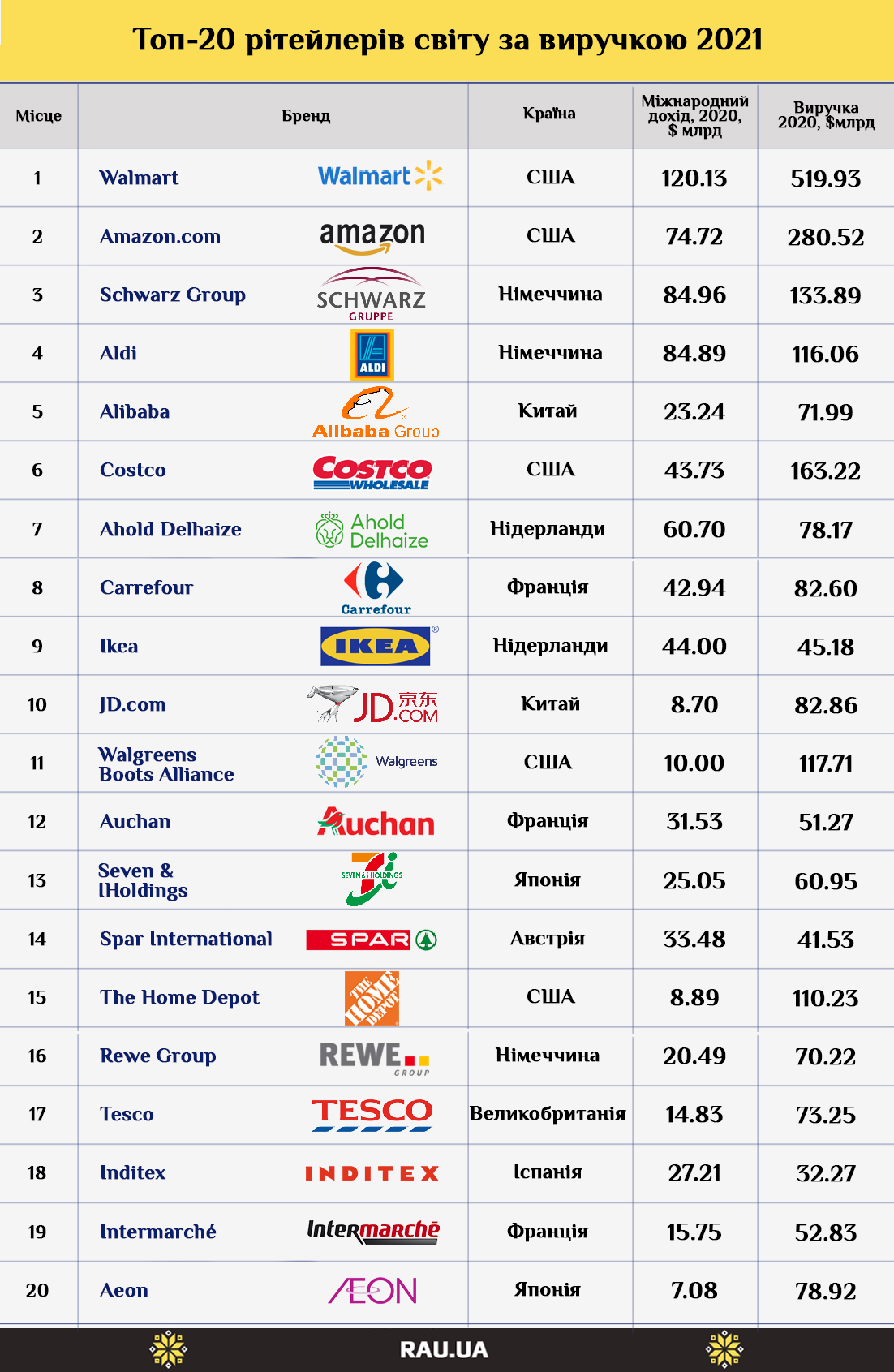 Кращі в світі: топ-20 торгових мереж світу за виручкою і міжнародним доходом 2021