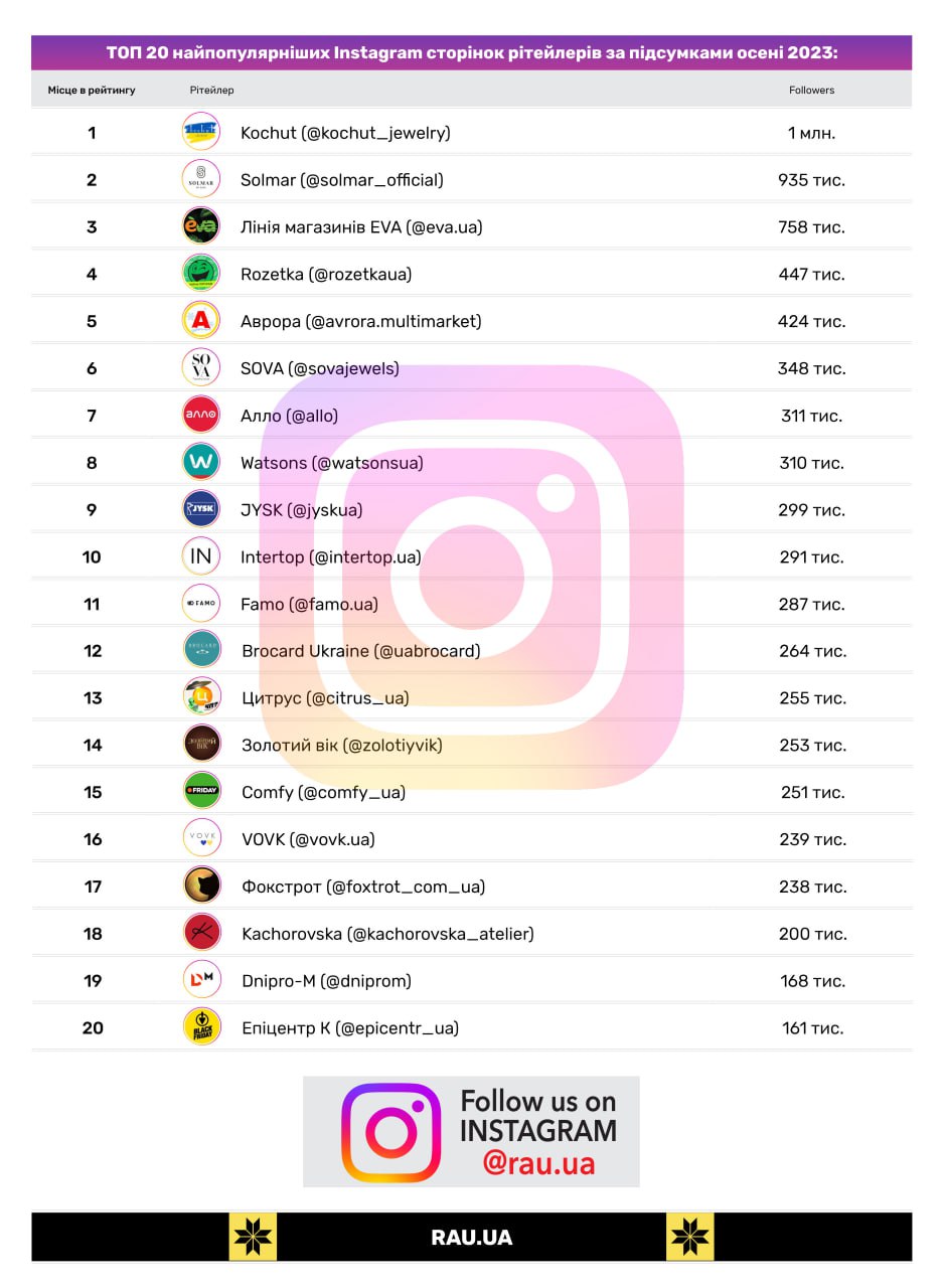 Ювелірний рітейлер Kochut відновив свій мільйон підписників і впевнено тримає першість серед рітейлерів за кількістю фанів в Instagram. Друге місце у двадцятці лідерів цього разу посіла мережа Solmar. Десять тисяч нових підписників здобула Лінія магазинів EVA, переконливо утримуючи третє місце у рейтингу.