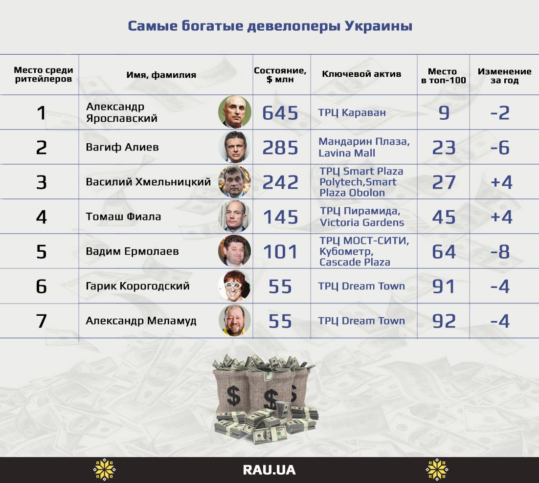 Власне кажучи, чистих рантьє серед найбагатших девелоперів небагато: Вагіф Алієв (Мандарин Плаза та Lavina Mall), а також Гарік Корогодський і Олександр Меламуд (Dream Town).