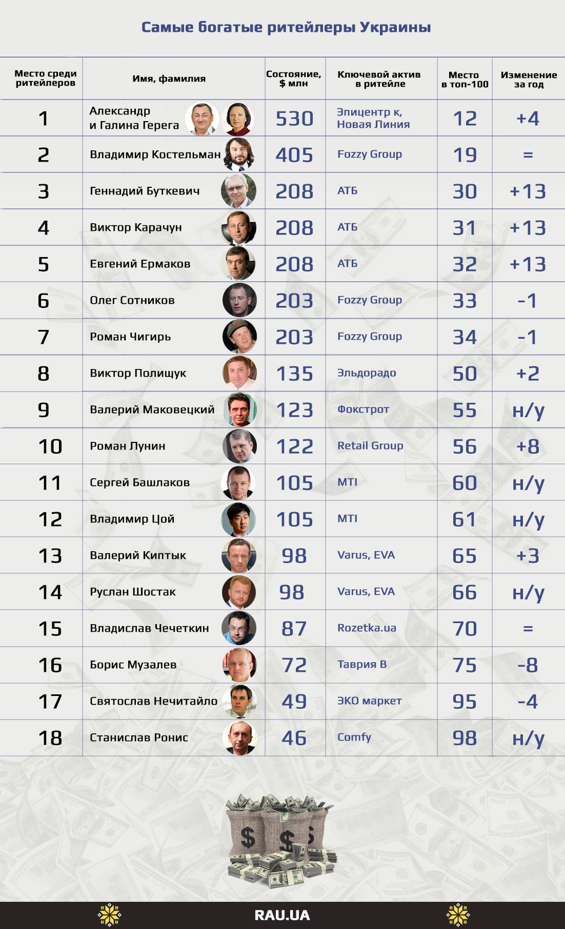 Аналіз складеного Фокусом списку ста найбагатших українців, проведений RAU, показує, що як мінімум чверть з мультимільйонерів так чи інакше пов’язані з рітейлом або девелопментом торгової нерухомості. Причому практично всі рітейлери за минулий рік тільки зміцнили свої позиції, а деякі – потрапили в рейтинг вперше або після довгої відсутності (позначені в графі «Зміна за рік» відміткою «н/у»). Багато власників компаній роздрібної торгівлі пов’язані з FMCG-сектором: власник Fozzy Group Володимир Костельман, співвласники АТБ Геннадій Буткевич, Віктор Карачун та Євген Єрмаков, власник Retail Group (Велика кишеня, Велмарт та інші мережі) Роман Лунін і так далі.