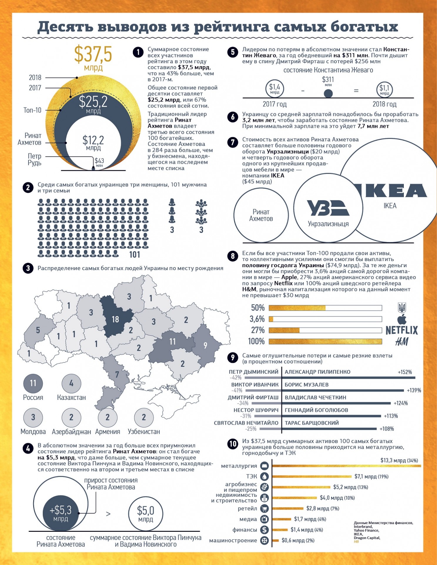 Верхні рядки в рейтингу займають звичні особи: офіційні доларові мільярдери вже не перший рік. Серед них Рінат Ахметов, Віктор Пінчук, Вадим Новінський, Ігор Коломойський, Петро Порошенко, Юрій Косюк, Костянтин Жеваго та інші. Всі вони володіють багатопрофільними холдингами, тож їх інтереси зосереджені у важкій промисловості, банківській сфері, виробництві тощо.
