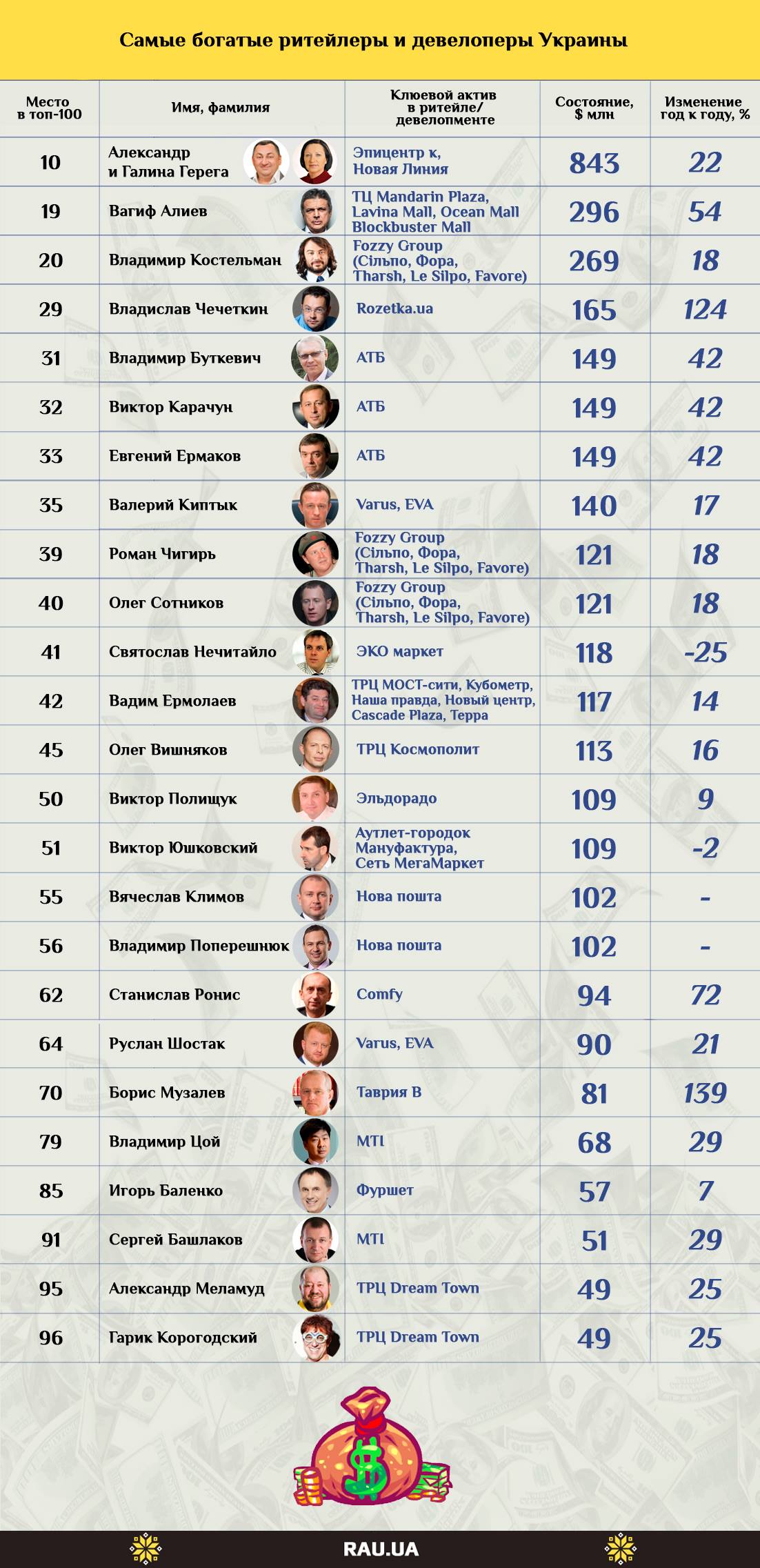 RAU вибрала зі списку топ-100 найбагатших бізнесменів країни тих, чиї ключові активи пов’язані з роздрібною торгівлею або комерційною нерухомістю.