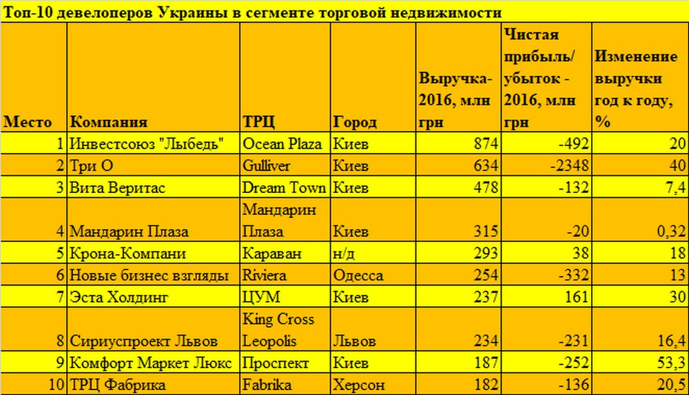 До таблиці потрібні деякі пояснення. Зокрема, Мандарин Плаза володіє не тільки однойменним торговим центром, а й часткою в БЦ Парус, а також ще кількома активами. Дані по групі даються без поділу по окремих об’єктах. Аналогічна ситуація і з Еста Холдинг: компанії належить ряд об’єктів. А київський ЦУМ в 2016 році був на реконструкції і навряд чи зіграв значну роль в генерації доходу і прибутку групи. Щодо Крона-Компані укладачі рейтингу не вказали, який саме з ТРЦ Караван мається на увазі: київський, харківський або дніпровський. Всі троє входять в орбіту групи DCH, але цілком імовірно, що належать різним юридичним особам і звітують окремо.