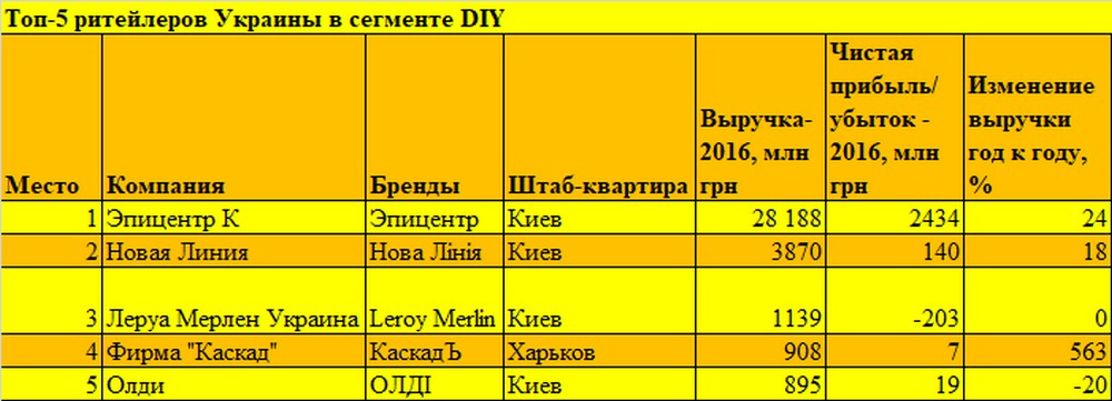Зрозуміло, укладачі списку 500 найбільших компаній України не обійшли увагою і інші сфери українського рітейлу, крім продуктових мереж. Але в цих сегментах конкуренція набагато менше, і великої кількості операторів в багатьох галузях немає: на ринку правлять бал 5-10 операторів. Яскрава ілюстрація цієї тези: ситуація в сегменті товарів для будівництва і ремонту, DIY (від англ. Do It Yourself – Зроби це сам).