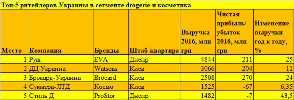 Проте серед drogerie-мереж розриви в першій п’ятірці значно нижче. Brocard-Україна, природно, працює дещо в іншому сегменті, ніж EVA, Watsons і ProStor, але оскільки конкурентів по виручці в Україні у нього зовсім немає, укладачі рейтингу віднесли його в цю категорію. Ймовірно, щоб взагалі не залишати за бортом топ-100.