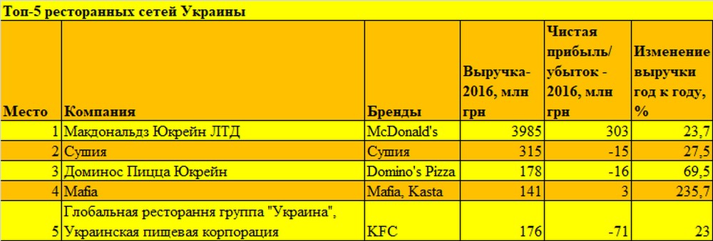 Завершує аналіз чергового випуску «Топ-100. Рейтинг найбільших» список найприбутковіших ресторанних мереж України. Зараз громадське харчування тісно пов’язане з рітейлом, досить сказати, що фуд-корти стали одним з ключових генераторів трафіку в ТРЦ. Тому їхня присутність в нашому переліку обов’язкова.