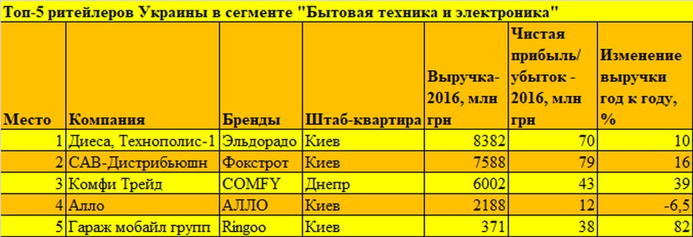 Схожа ситуація і у випадку з роздрібною торгівлею побутовою технікою та електронікою: є яскраво виражена трійка лідерів, з якими іншим конкурувати складно. Хоча включення в один рейтинг супермаркетів техніки (Фокстрот, Ельдорадо, COMFY) і точок з продажу мобільних пристроїв і аксесуарів викликає подив: ці компанії працюють в різних сегментах і порівнювати їх некоректно.