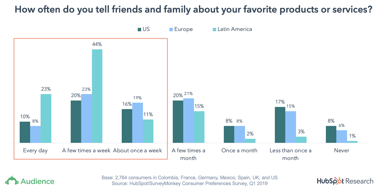 Більше половини покупців розповідають своїм друзям і рідним про улюблені продукти хоча б раз на тиждень або частіше. Споживачі в Латинській Америці роблять це більш охоче – 78% покупців в Колумбії і Мексиці розповідають про улюблені продукти раз на тиждень, а 23% – кожен день.