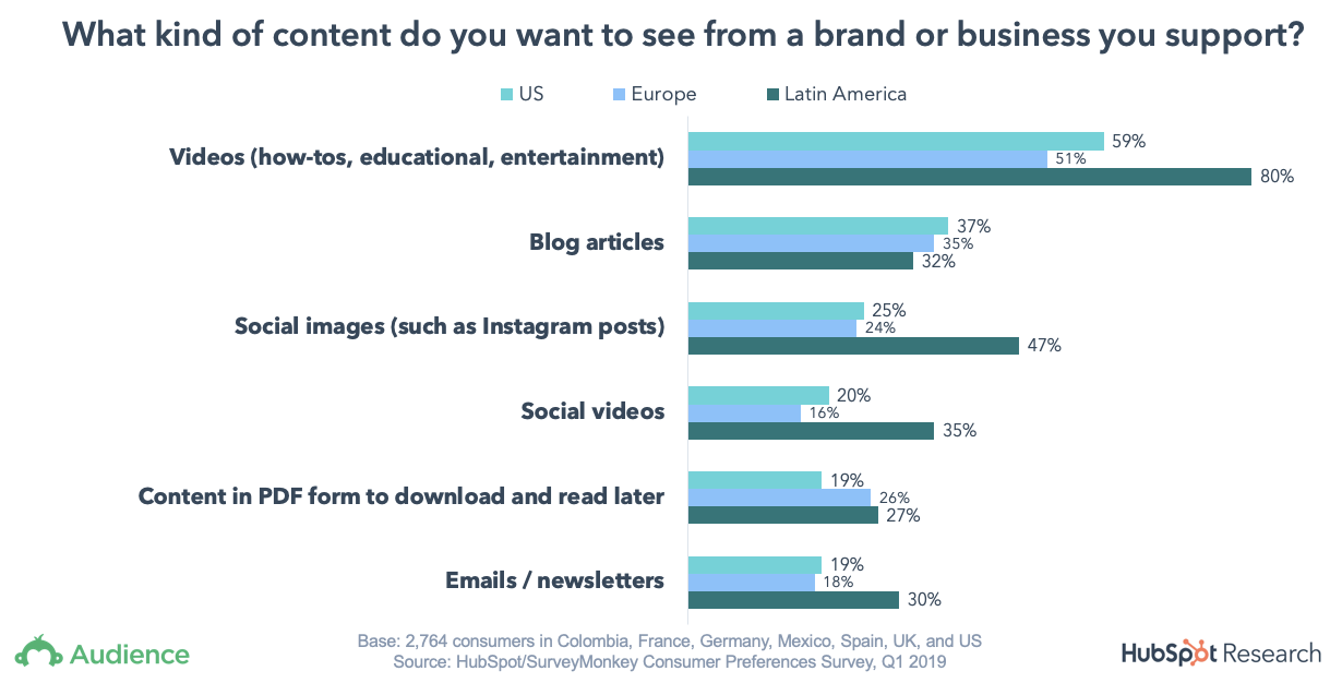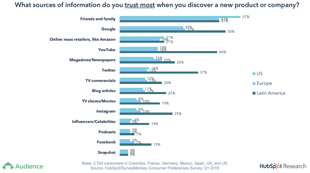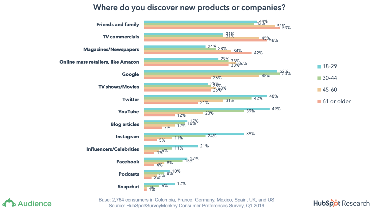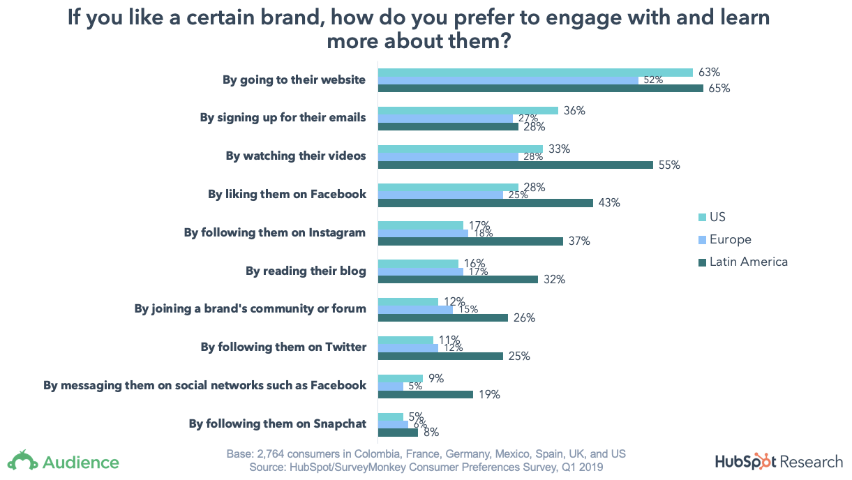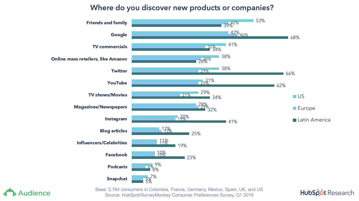 На початку 2019 року HubSpot Research разом з SurveyMonkey провели дослідження, щоб дізнатися бажання користувачів в соціальних мережах і які в них купівельні переваги. Дослідження охопило більше 2700 покупців в Колумбії, Франції, Німеччини, Мексиці, Іспанії, Великобританії і США.
