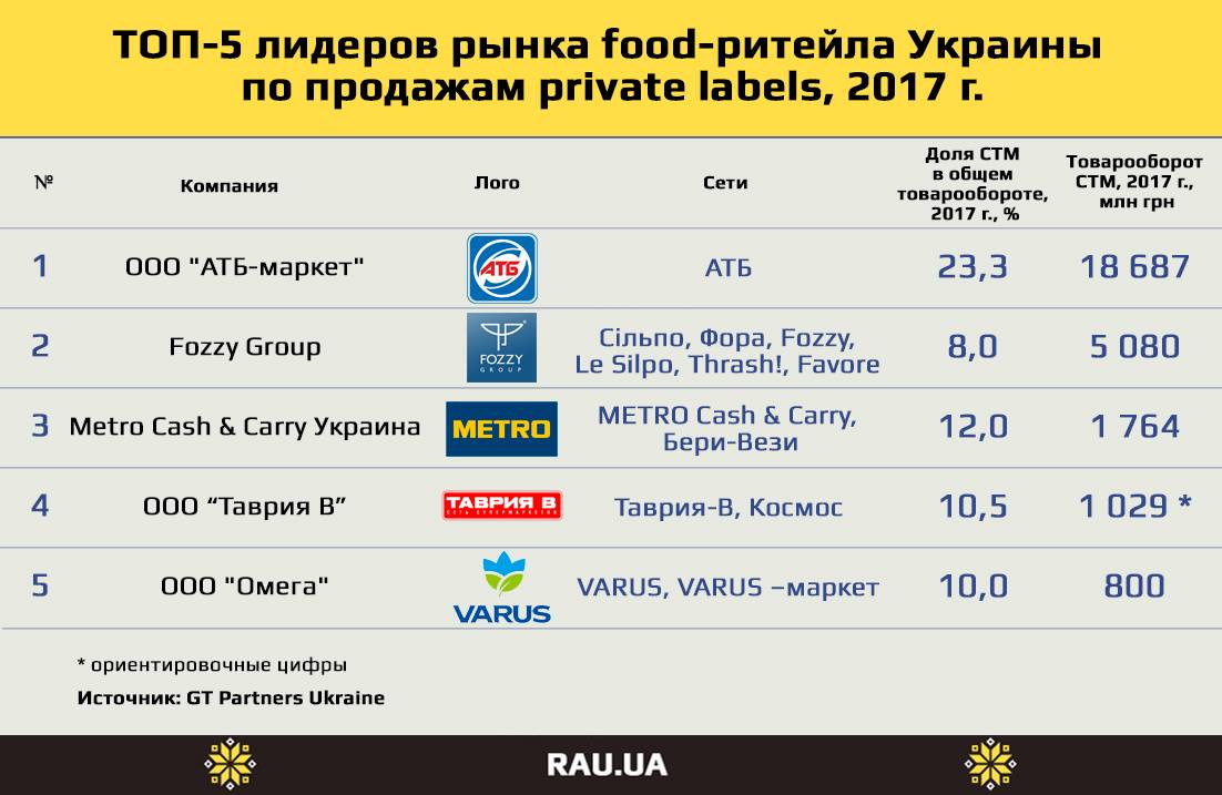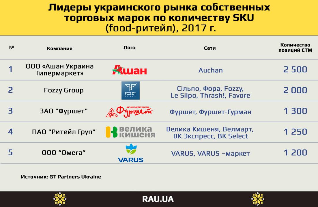 За кількістю власних торгових марок в Україні немає конкурентів у Ашан: французька мережа пропонує близько 2500 позицій private label. Найближчий переслідувач – Fozzy Group, яка розвиває мережі Сільпо, Фора, Le Silpo, Thrash!, Favore – представила приблизно 2000 найменувань товарів. Решта помітно відстали – у Фуршету 1300 продуктів ВТМ, у Retail Group (Велика Кишеня, ВК Експрес, Велмарт) – 1250, у Varus – 1200.