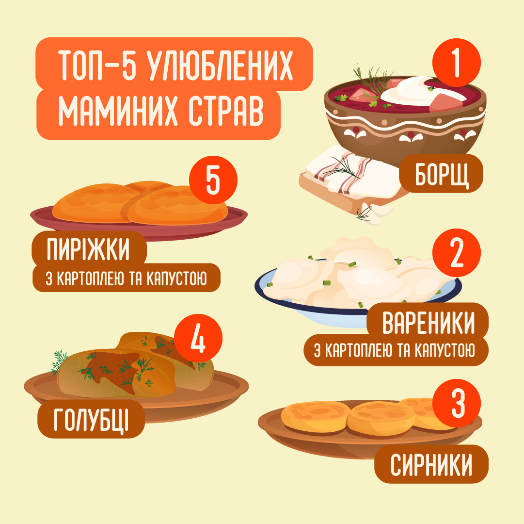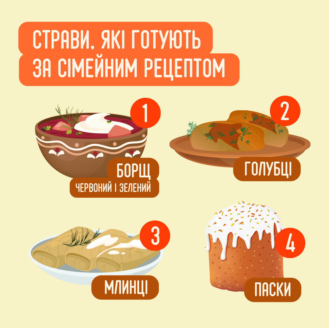 У списку страв, які готують за сімейним рецептом, знову лідирує борщ — червоний та зелений. Окрім того, українці часто готують голубці, млинці та паски так, як це роблять їхні мами.