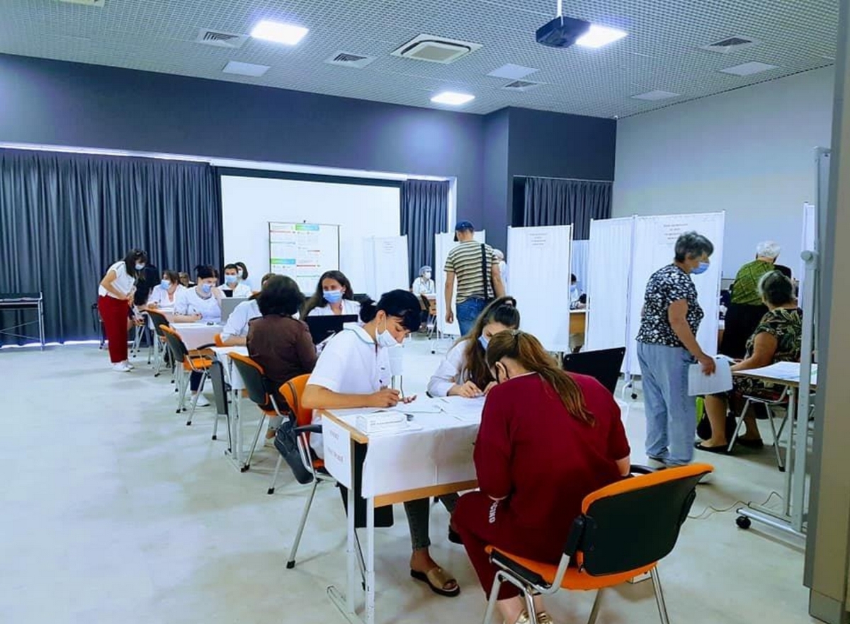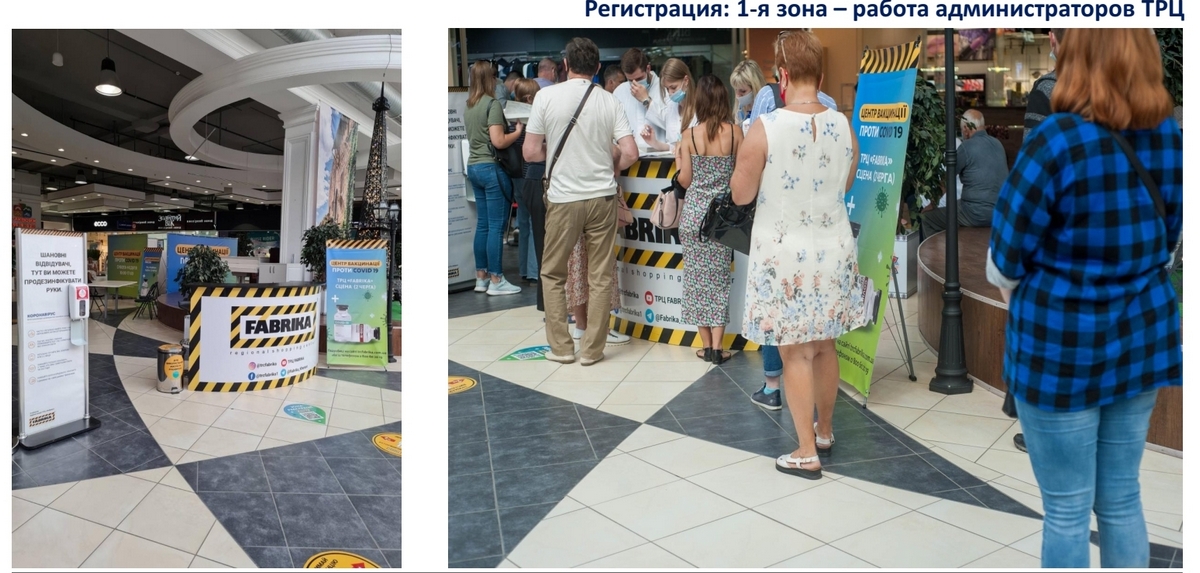 Щоб розвантажити локацію, де безпосередньо буде проходити вакцинація, спочатку виділили спеціальну зону первинного заповнення документів (заповнення амбулаторної картки та письмову згоду пацієнта). Для прискорення процесу, і щоб розвантажити медперсонал, адміністратори ТРЦ допомагали з оформленням паперів. Самі уколи вакцини проводилися в спеціальному мобільному кабінеті.