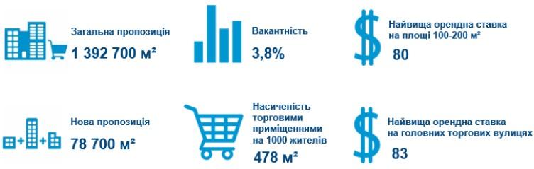 В першому кварталі 2019 року було введено в експлуатацію два об’єкти: ТЦ Oasis (GLA 13 200 кв. м) і ТЦ Smart Plaza Оболонь (GLA 10 000 кв. м). В серпні відбувся запуск крупного об’єкту – ТРЦ River Mall (GLA 55 500 кв. м). Таким чином, об’єм нової пропозиції станом на серпень 2019 року складає близько 78 700 кв. м. Загальна пропозиція якісних торгових приміщень в місті Київ станом на початок серпня 2019 року збільшилась на 6% в порівнянні з кінцем 2018 року і склала 1 392 700 кв. м.
