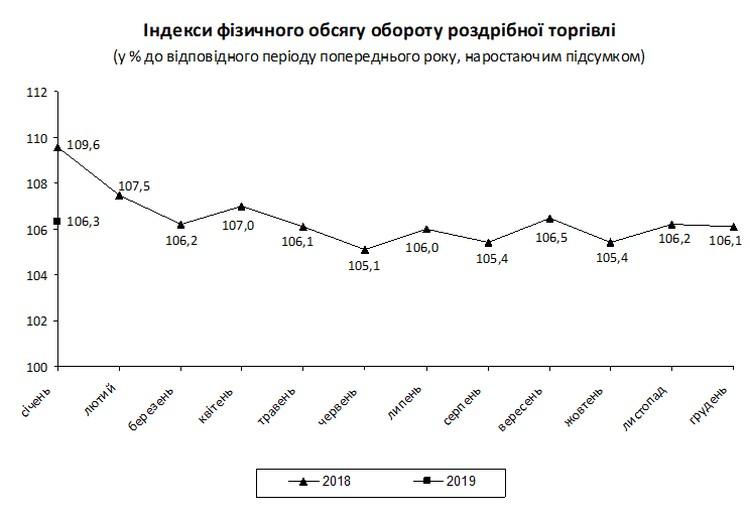 Про це у черговому експрес-випуску повідомляє Держстат. За підрахунками відомства, у січні 2019-го у порівнянні з січнем 2018-го оборот роздрібної торгівлі України у порівняних цінах збільшився на 6,3%. Відзначимо, що у першому місяці минулого року відносно січня 2017-го зростання складало в півтора рази більше – 9,6%.