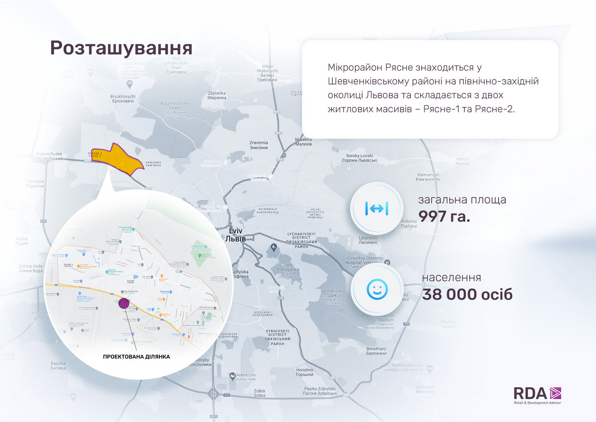 Розташований він у мікрорайоні Рясне на північно-західній околиці Львова. Загальна площа двох житлових масивів мікрорайону – 997 га, тут проживають приблизно 38 000 разів. Це буде єдиний ТРЦ у північно-західній частині Львова, й охопить мешканців мікрорайонів Рясне, Рясне-2, Рясно-Руський, селища Івано-Франкове та найближчої агломерації.