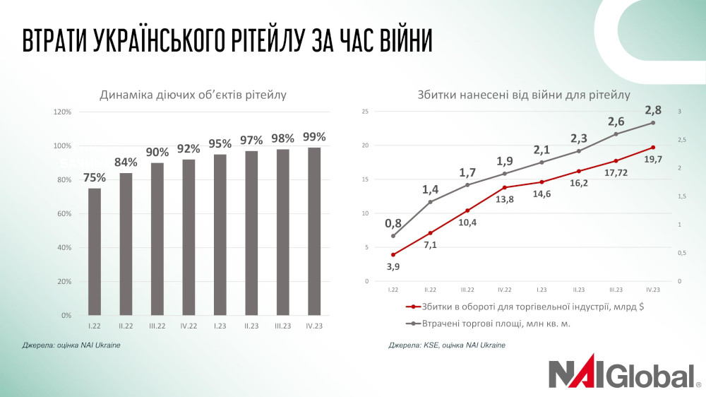У повномасштабну війну збитки в обороті для торговельної індустрії на кінець 2023 року склали майже $20 млрд. А втрачені торгові площі – майже 3 млн кв. м.