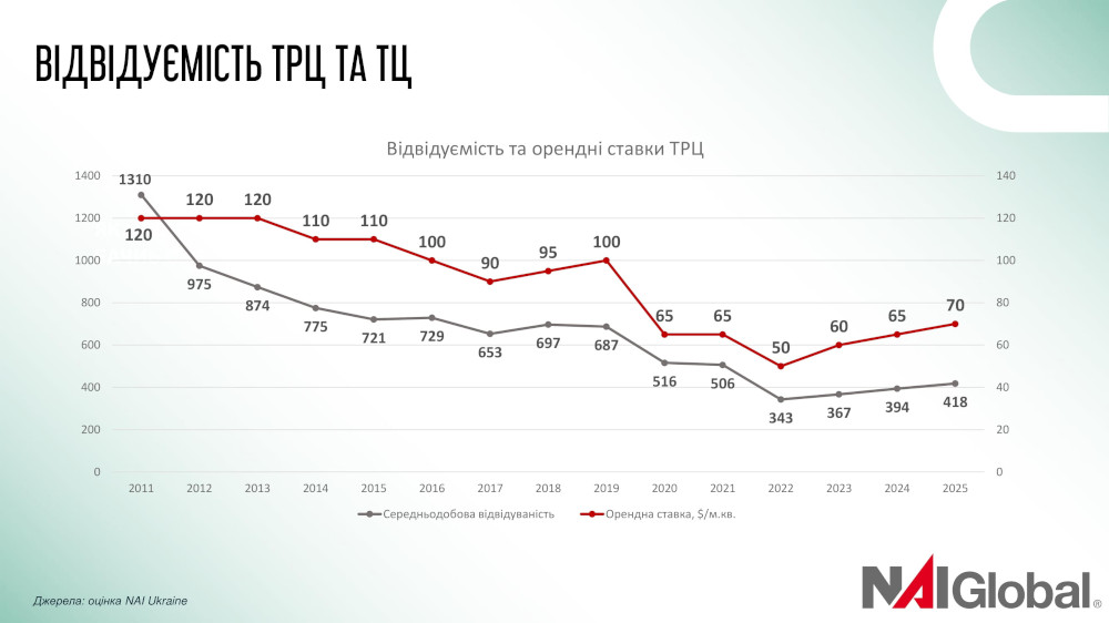 Через велику війну, відвідуваність в ТРЦ скоротилася майже в три рази. Проте це не тільки український тренд, пов’язаний із вторгненням, скорочення почалося ще у пандемію коронавірусу. І перше падіння було в 2019 році (показано на графіку). Орендні ставки в порівнянні з «ковідними часами» впали майже в два рази.