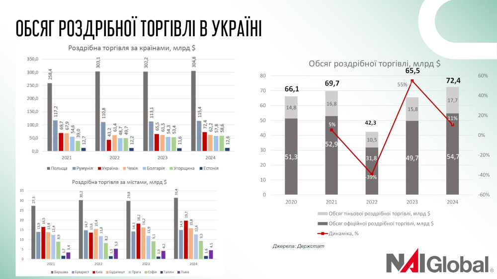 Також попри повномасштабну війну Україна не втратила свою третю позицію у Східній Європі за обсягом роздрібної торгівлі, попереду – Польща та Румунія. І Київ є третьою столицею у списку по роздрібній торгівлі, попереду – Варшава та Бухарест.