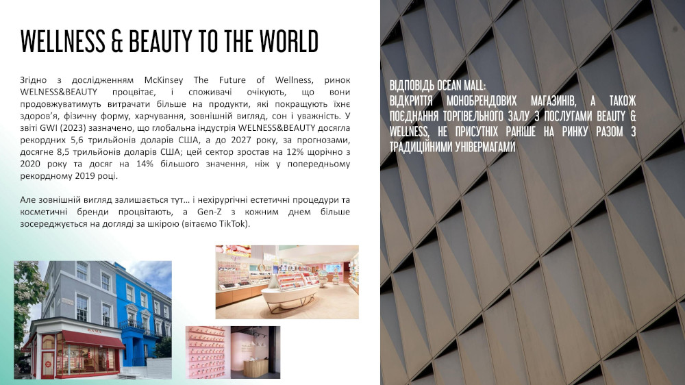Тренд Wellness & Beauty шалено зростає, бо споживачі продовжують витрачати на продукти для здоров’я, фізичної форми, харчування, зовнішнього вигляду, сну тощо. В ТРЦ Ocean Mall будуть не тільки традиційні універмаги, а й відкриття монобрендових магазинів.