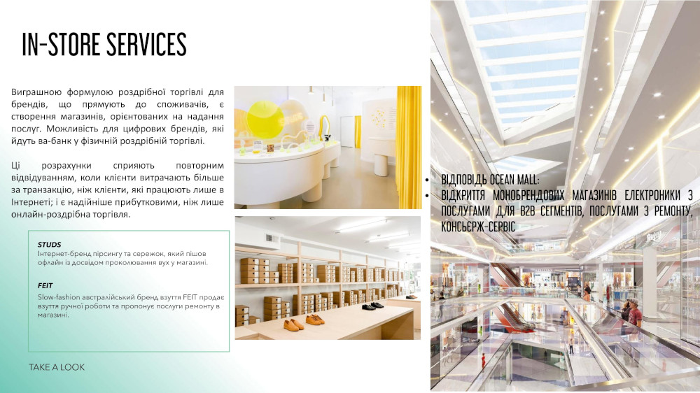 Щоб збільшити час проводження клієнтів в магазині, втілимо тренд In-Store Services. Це відкриття монобрендових магазинів електроніки з послугами для В2В сегментів, послугами з ремонту та консьєрж сервіс.