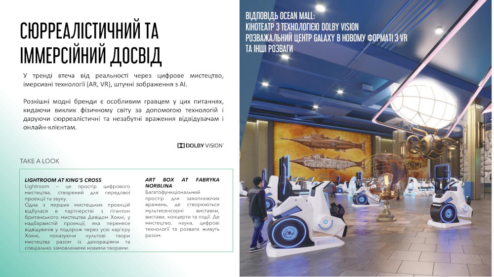 Ще один тренд – сюрреалістичний та імерсійний досвід. Відкриється розважальний центр Galaxy у новому форматі – доповнений VR-ефектами. І кінотеатр з технологією Dolby Vision, яка вперше представлена в Україні.