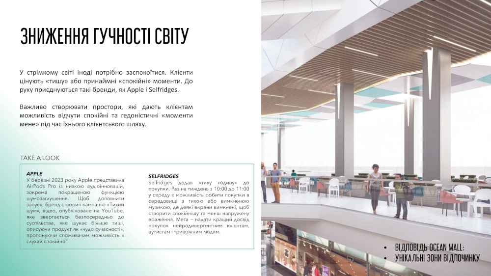 Ще один тренд, який спостерігається, як в ритейлі, так і в комерційній нерухомості – зниження гучності світу. Тобто в ТРЦ Ocean Mall будуть специфічні зони відпочинку, щоб відчути спокійні моменти.