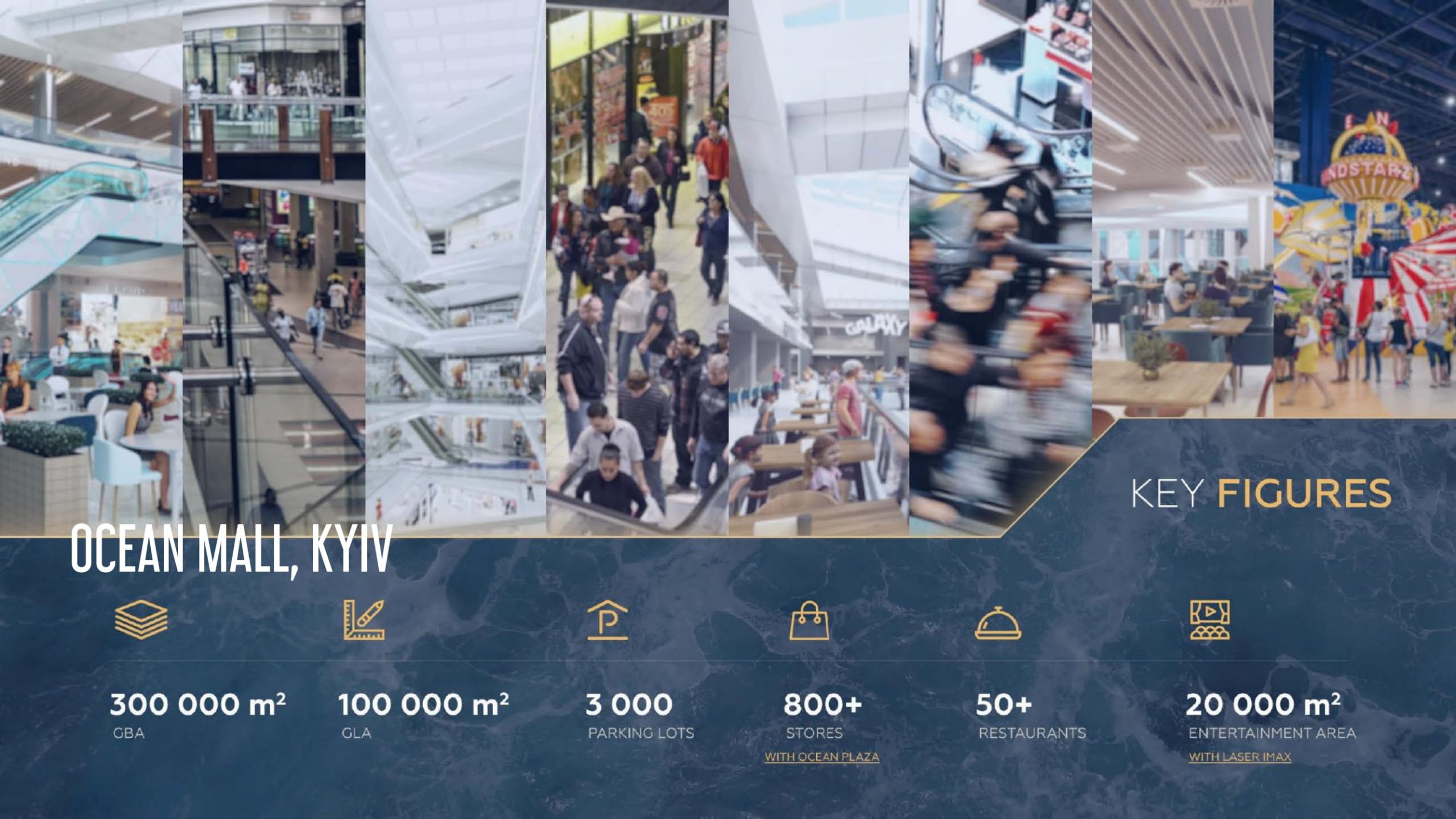 GBA ТРЦ Ocean Mall – 300 000 кв. м, GLA – 100 000 кв. м, 3000 місць для парковки, понад 800 магазинів та 50 ресторанів і 20 000 кв. м розважальної зони.