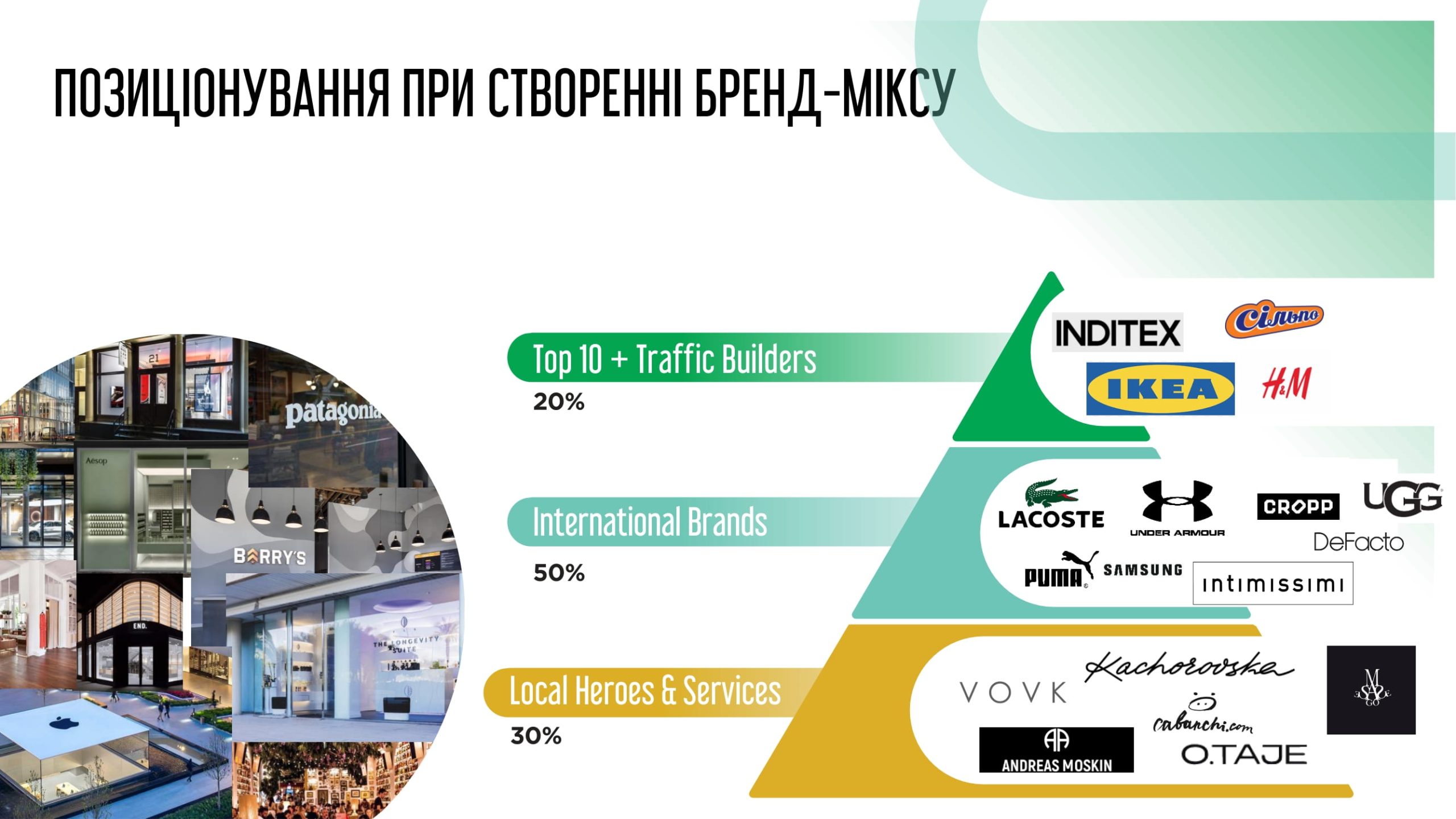 Планується, що 20% – це будуть трафікоутворюючі бренди (Сільпо, Inditex, H&M, IKEA), 50% – міжнародні (Lacoste, Puma, Cropp, Samsung та інші) та 30% – українські (Vovk, Kachorovska та інші).