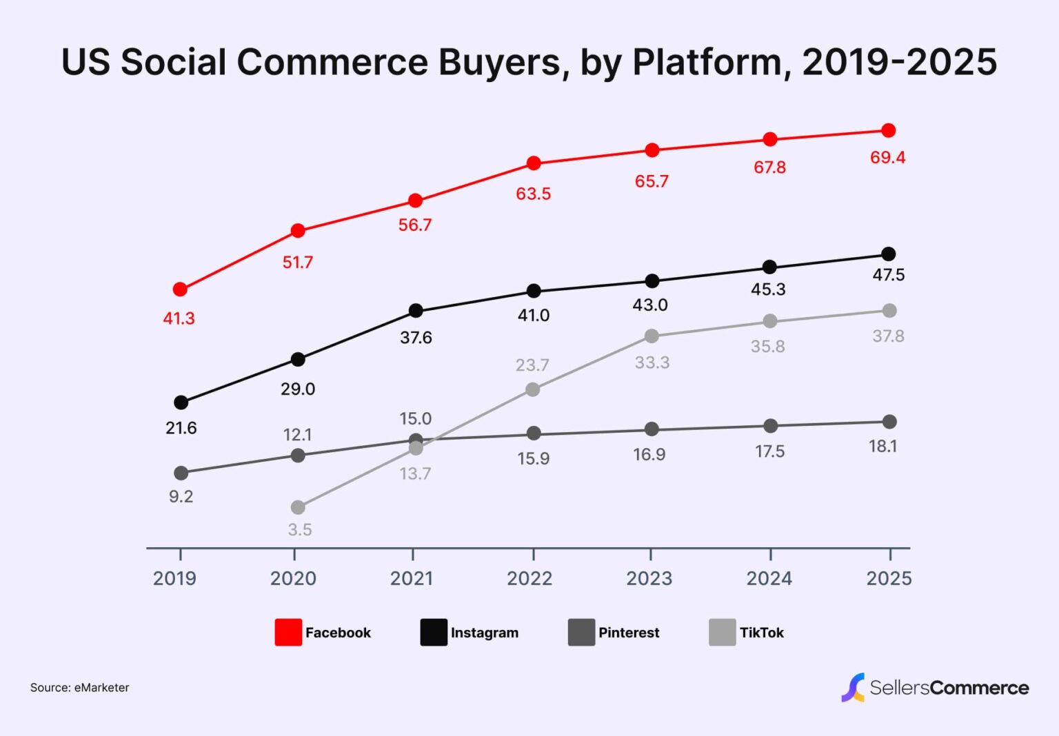 Платформи соціальних мереж, де в світі зареєстровано З 5 млрд людей, чудово підходять для електронної комерції. Станом на 2024 рік цей ринок оцінюється в $1,69 трлн, що на 30,81% більше порівняно з попереднім роком. Цей тренд продовжується, і до 2026 року, за прогнозами експертів, галузь становитиме вже $2,9 трлн. Згідно зі звітами Statista, сектор соціальної комерції зростатиме на 29% у середньому з 2022 по 2030 роки, досягнувши позначки в $8,5 трлн до кінця прогнозованого періоду. Facebook, Instagram, Pinterest та TikTok є найбільш популярними платформами для соціальної комерції.