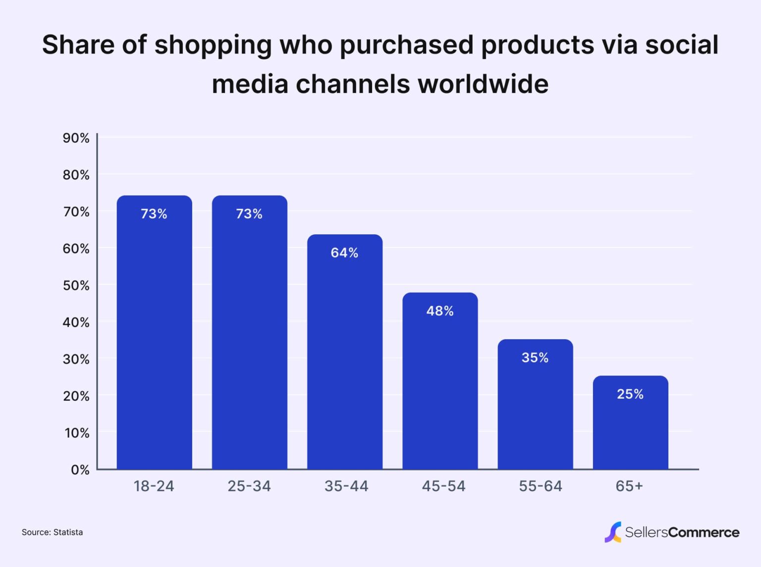 Люди віком від 18 до 34 років найчастіше купували через соціальні мережі: близько 73% з них сказали, що купували щось через канали соціальних мереж. З іншого боку, люди віком від 65 років рідше купували речі через соціальні мережі, причому лише близько чверті з них робили це.