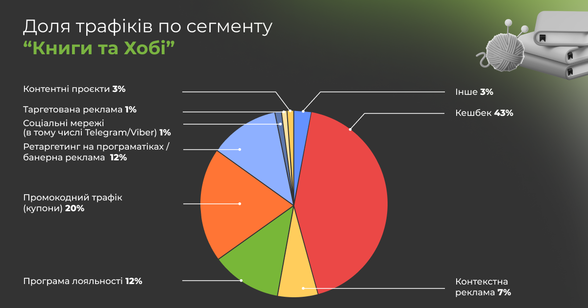 У сегменті книг і хобі найбільшу популярність має кешбек (34%). Купони займають друге місце (20%) – адже всі шукають додаткові знижки. Ретаргетинг (12%) допомагає нагадати про покупку і стимулює її завершення. Програми лояльності (12%) забезпечують стабільний трафік серед клієнтів, які люблять накопичувати бали.