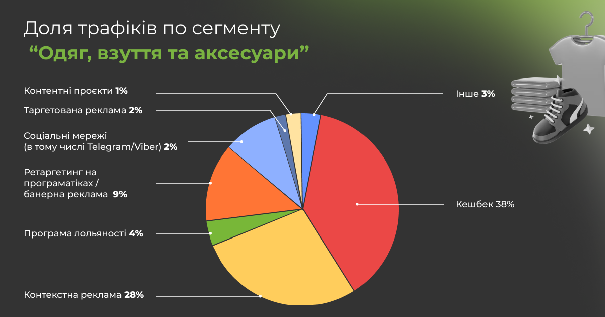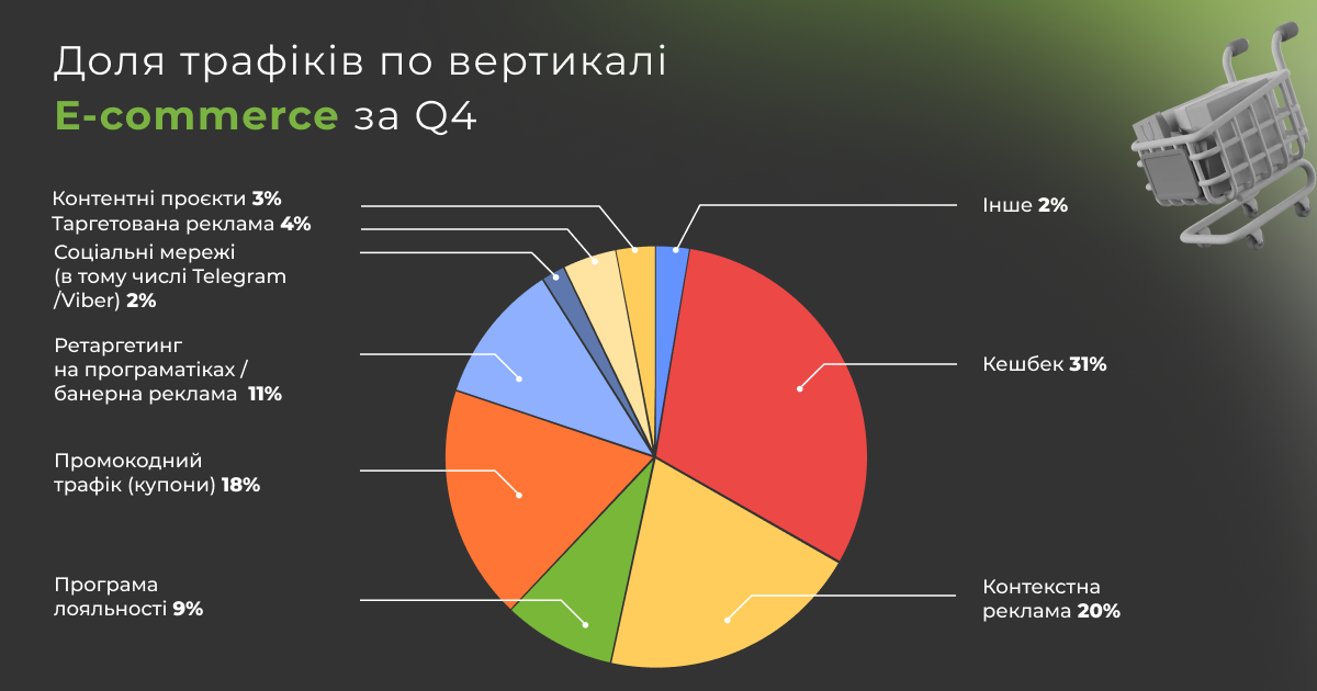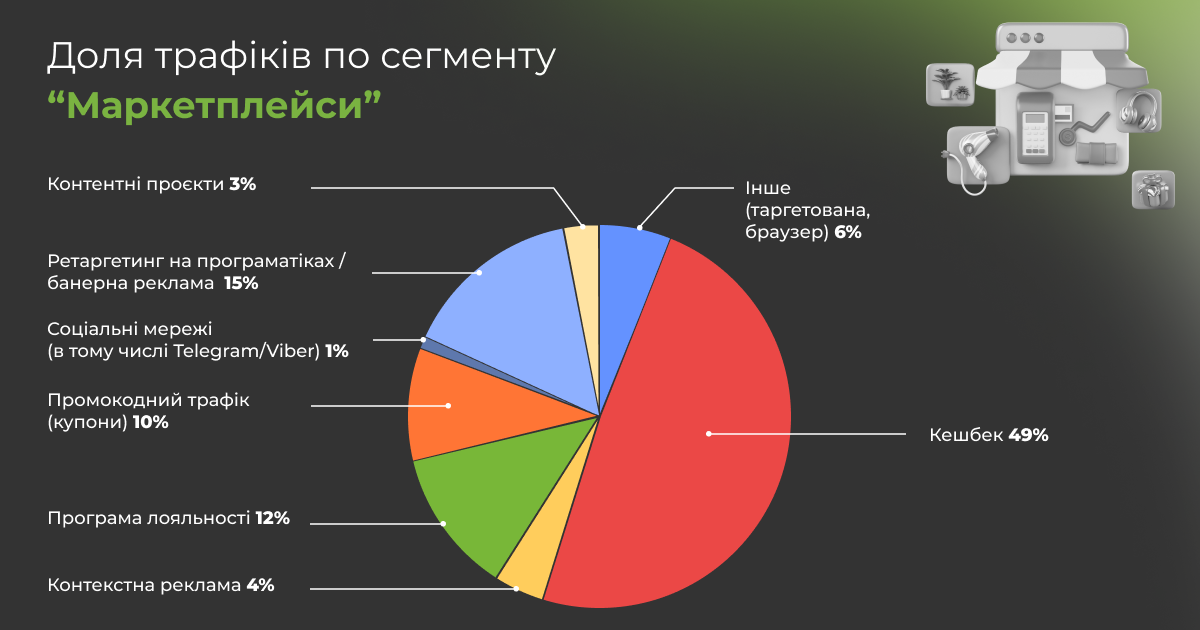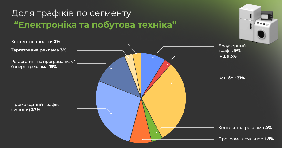 В цілому різні сегменти е-commerce демонструють свої унікальні тенденції в розподілі трафіку. Наприклад, у сегменті “Електроніка та побутова техніка” кешбек (31%) є найефективнішим каналом. Водночас промокоди (27%) стимулюють швидке прийняття рішень, а ретаргетинг (13%) ефективно повертає клієнтів, які вагалися з покупкою.