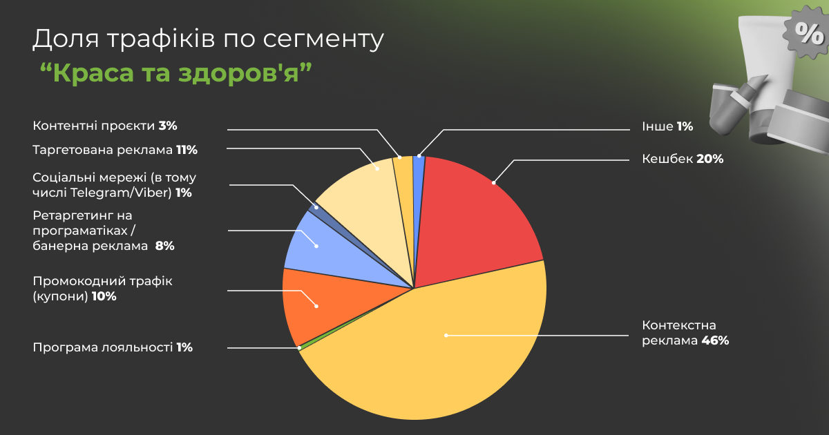 Сегмент краси та здоров’я демонструє домінування контекстної реклами (46%), але не менш важливим є, звичайно, і кешбек (20%) з купонами (10%).