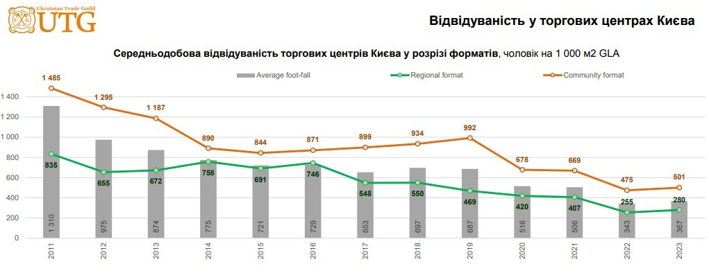 Як зазначає Дмитро Топольськов, дані відвідуваності ТРЦ загалом по Україні варіюється в залежності від від формату ТЦ. Так, відвідуваність малих ТЦ сягає 535 осіб на місяць на 1000 кв. м GLA, для середніх — 445, для великих — 425.