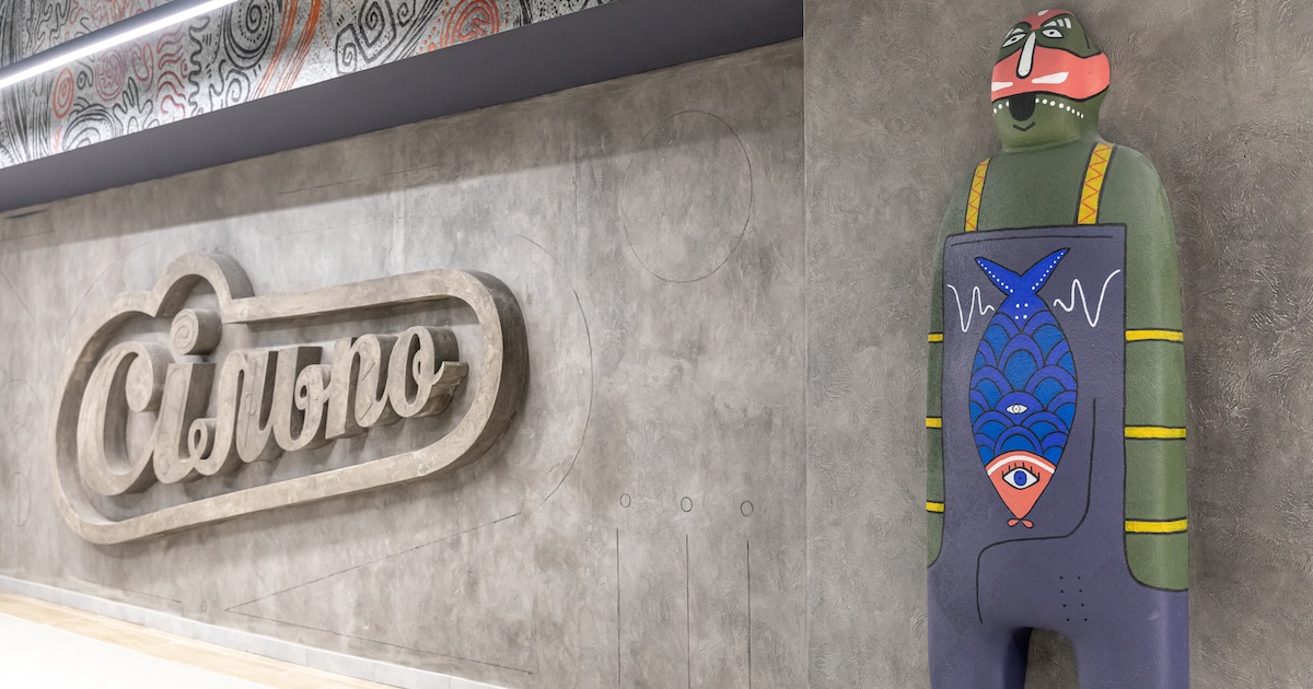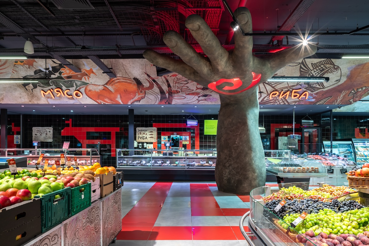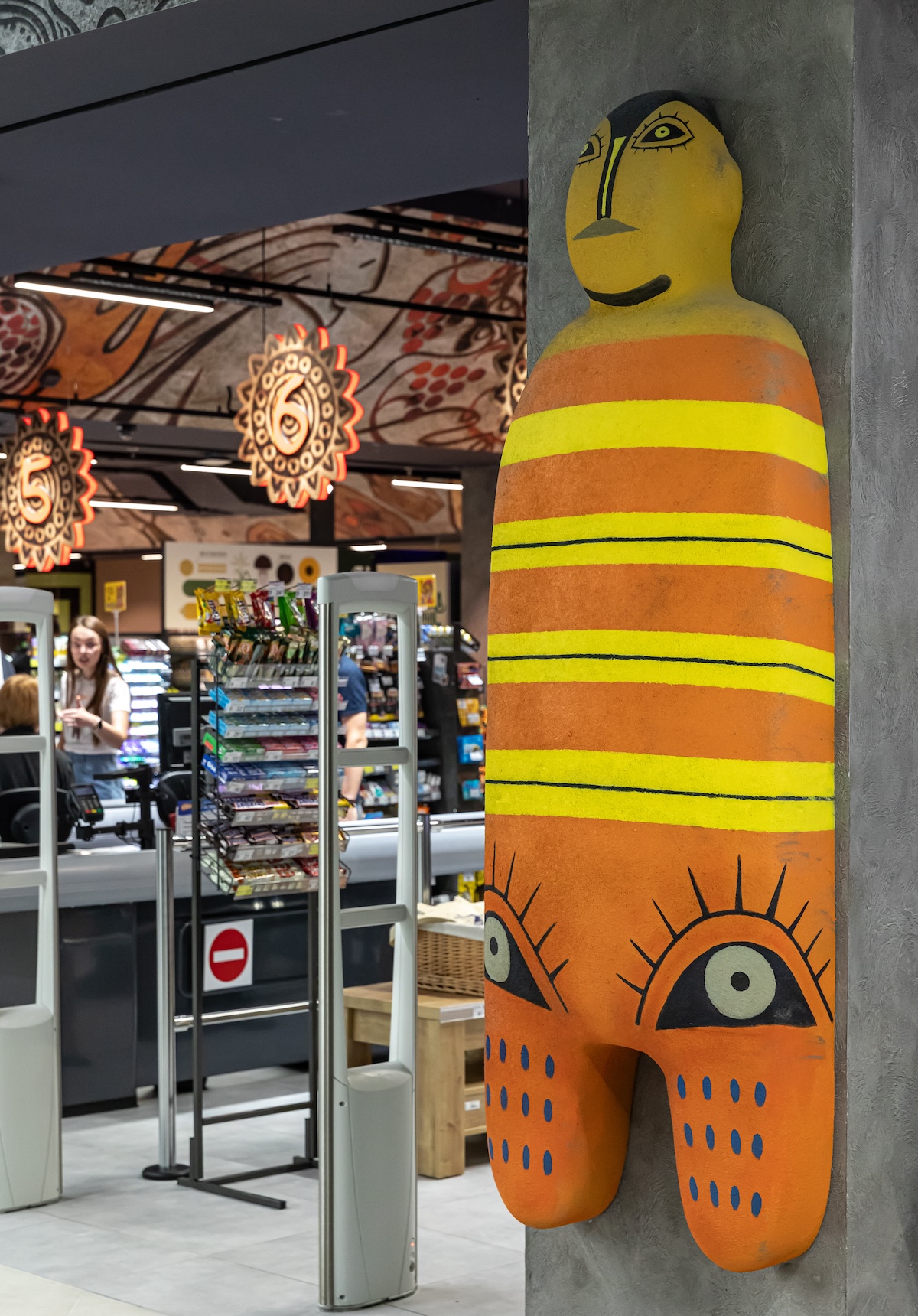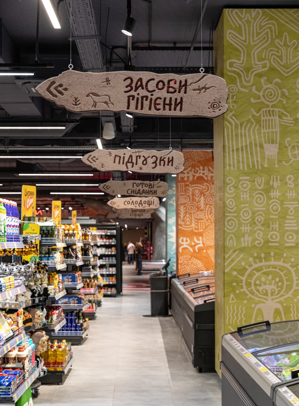 На вході магазину площею 1452 кв. м гостей зустріне камʼяний логотип Сільпо, де зашифровано таємне послання, а камʼяні ідоли та баба з приазовських степів супроводять у полюванні на найсмачніше.