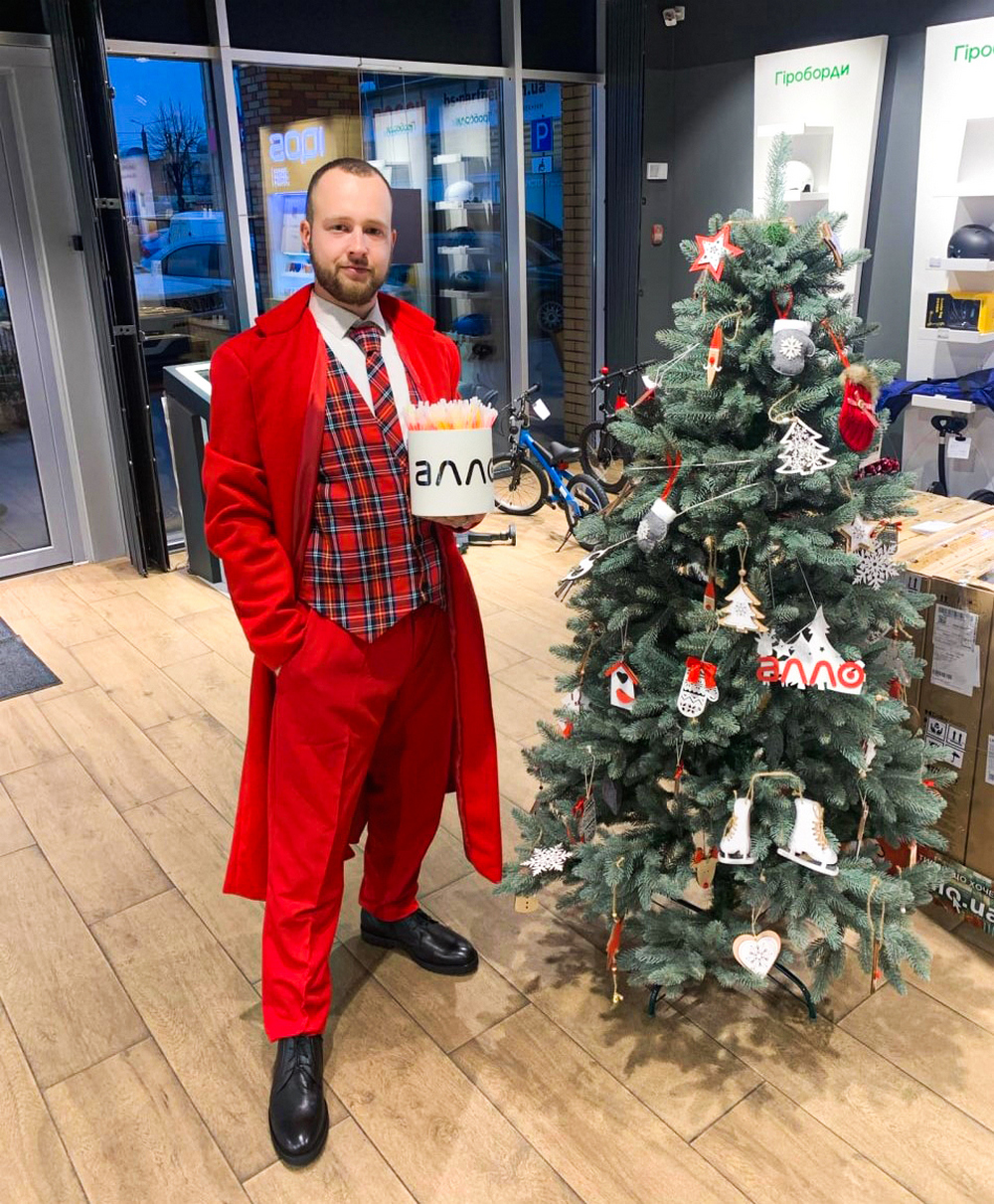 Для 12 колоритних аніматорів, які втілювали образ сучасного та модного Санти в шоурумах Алло, спеціально було створено новорічні костюми з червоного велюру: пальто, штани, картатий жилет та краватку. В цьому образі Санта помолодшав і виглядав стильно та модно. Малечі модний стильний Санта дуже сподобався, тож вони радо з ним спілкувалися, розповідали, хто був чемним або ні, фотографувалися та розбирали подарунки.