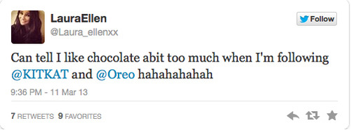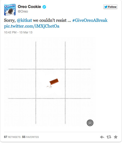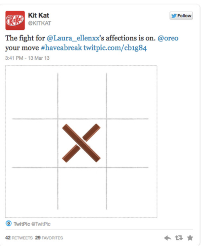 Цей твіт надихнув Kit Kat зробити перший крок, кинувши виклик Oreo в грі «хрестики-нулики» в рамках того, що вони назвали «боротьбою за прихильність Лори Еллен». У відповідь на перші кроки Oreo вирішив похвалити смак конкурента і покласти край грі, з’ївши батончики Kit Kat.