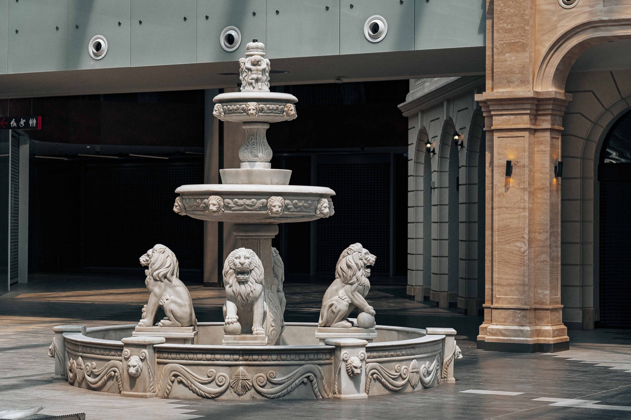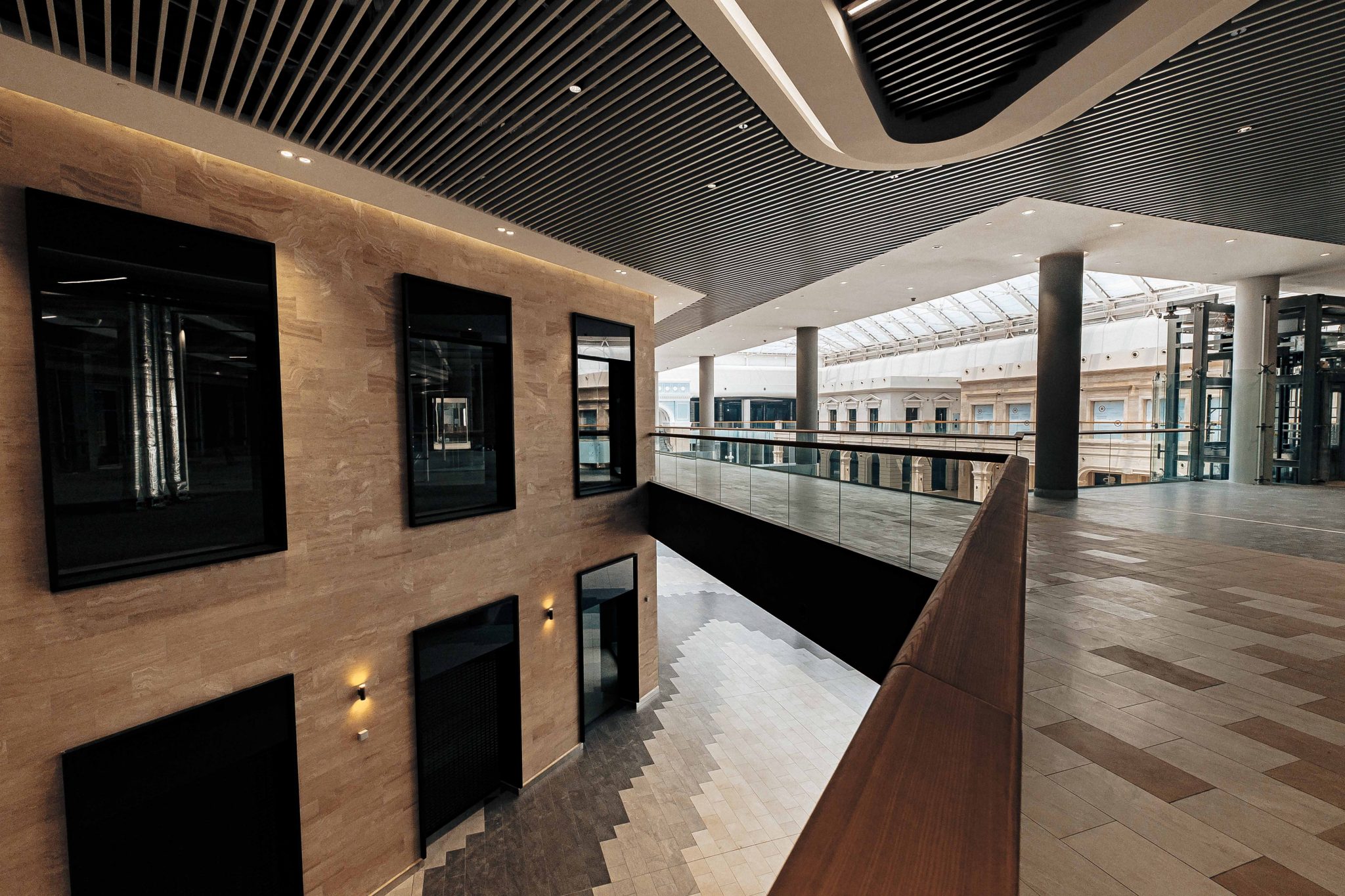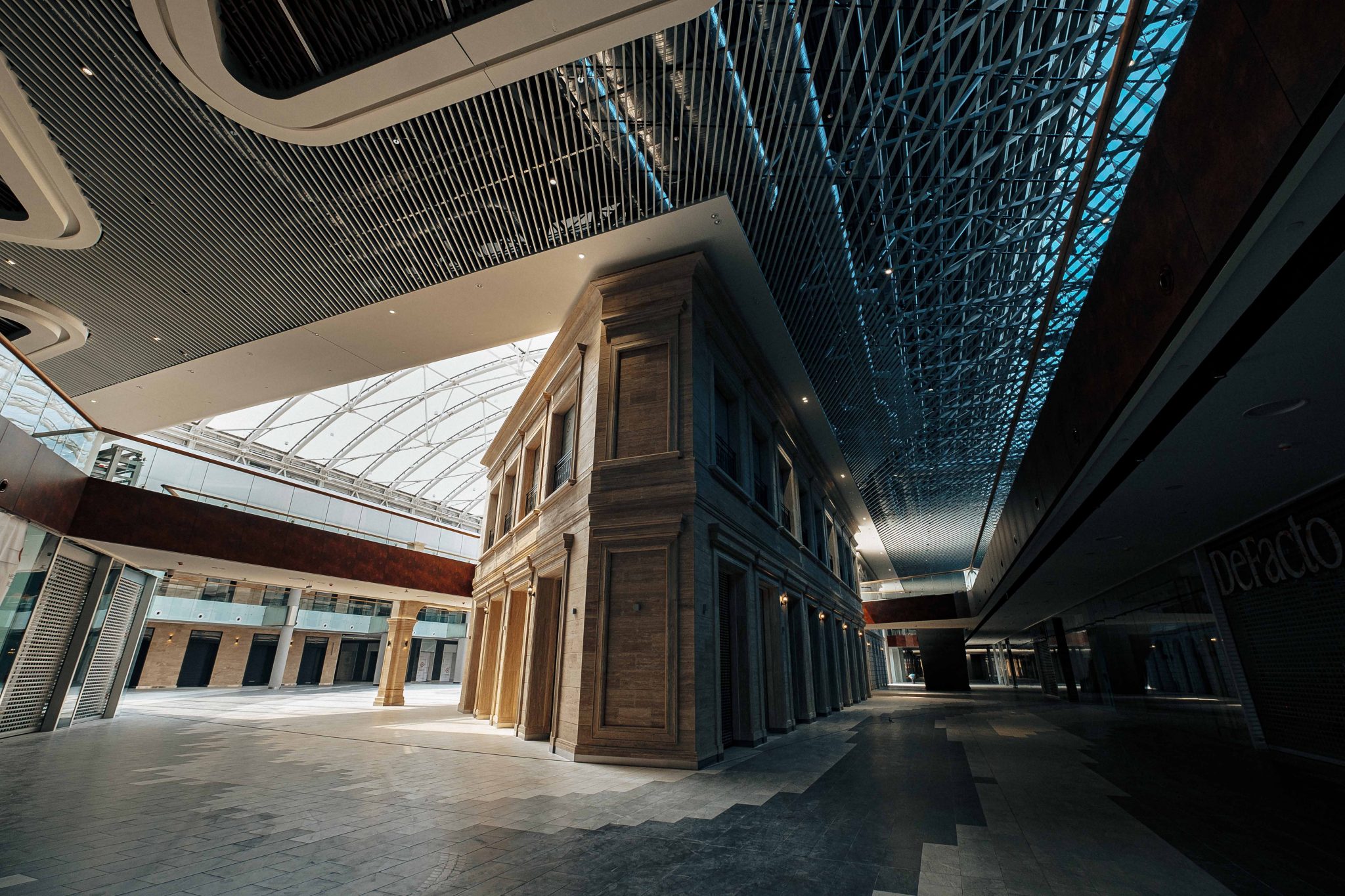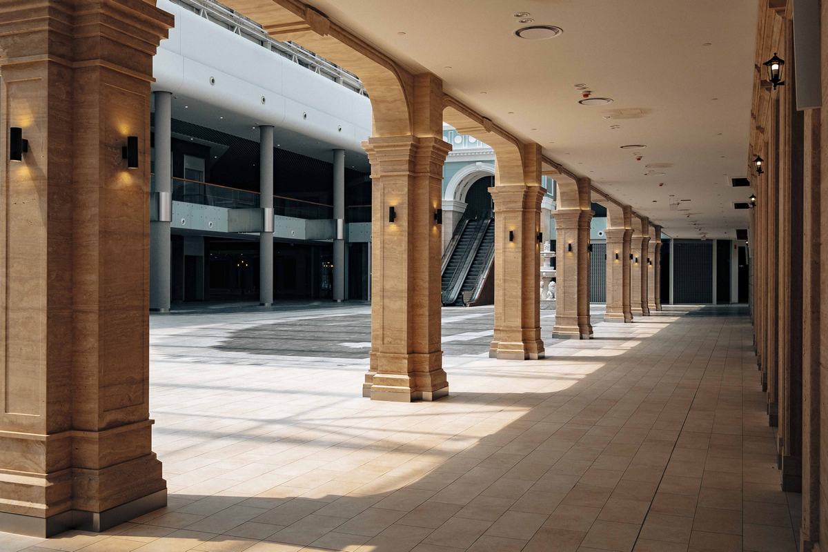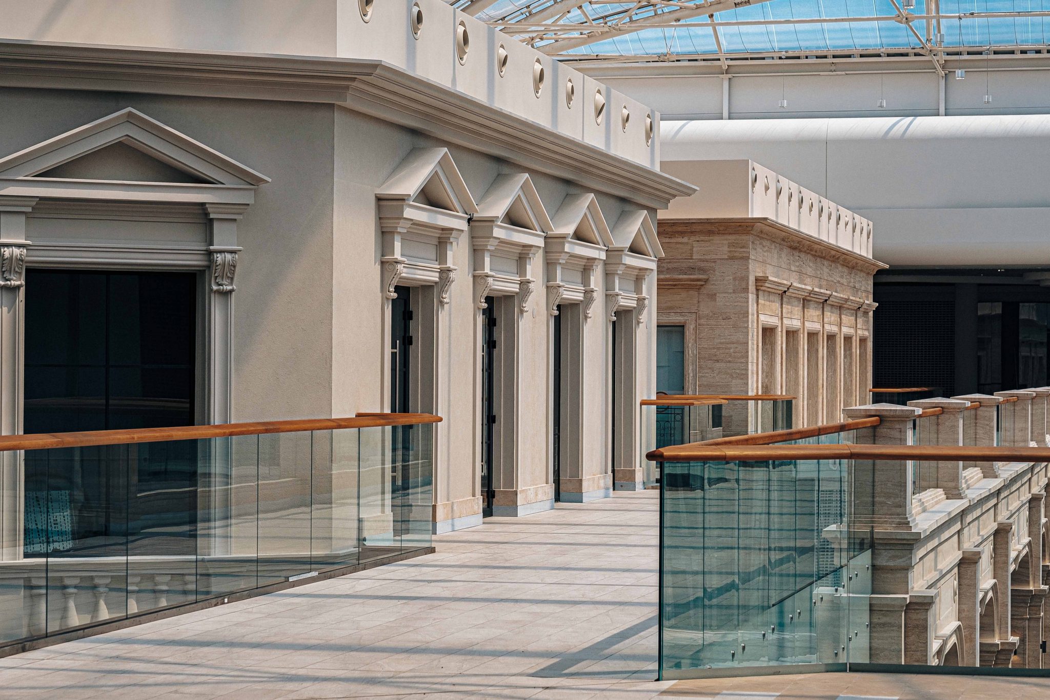 Центральна площа на 1300 кв. м оформлена в стилі міської еспланади з класичною архітектурою, фонтаном і куполом. Оточують її чотири двоповерхових стилізованих будівлі з балконами, вікнами, фризами і колонами. В них на першому поверсі розмістяться магазини парфумерії, аксесуарів і ювелірних виробів, а на другому – ресторани.
