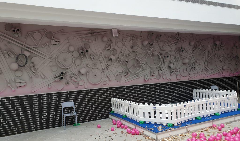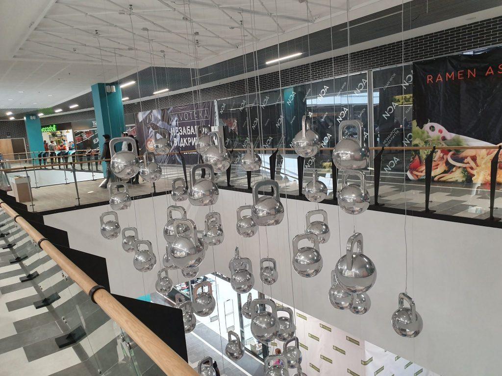 Дух чемпіонства у об’єкта дійсно є – оформлення багатьох стін витримано в візуальній айдентиці спорту, атріум прикрашають гирі, кругом спортивні інсталяції, гігантська бігова доріжка, SportLife вже до кінця березня відкриє басейн, також триває монтаж футбольного поля.