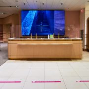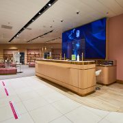 - Для чіткого дотримання принципів соціального дистанціювання в ЦУМ розроблена додаткова навігація та розмітка на центральному вході в будівлю, перед ескалаторами, на касових зонах, в примірочних та на шостому поверсі.