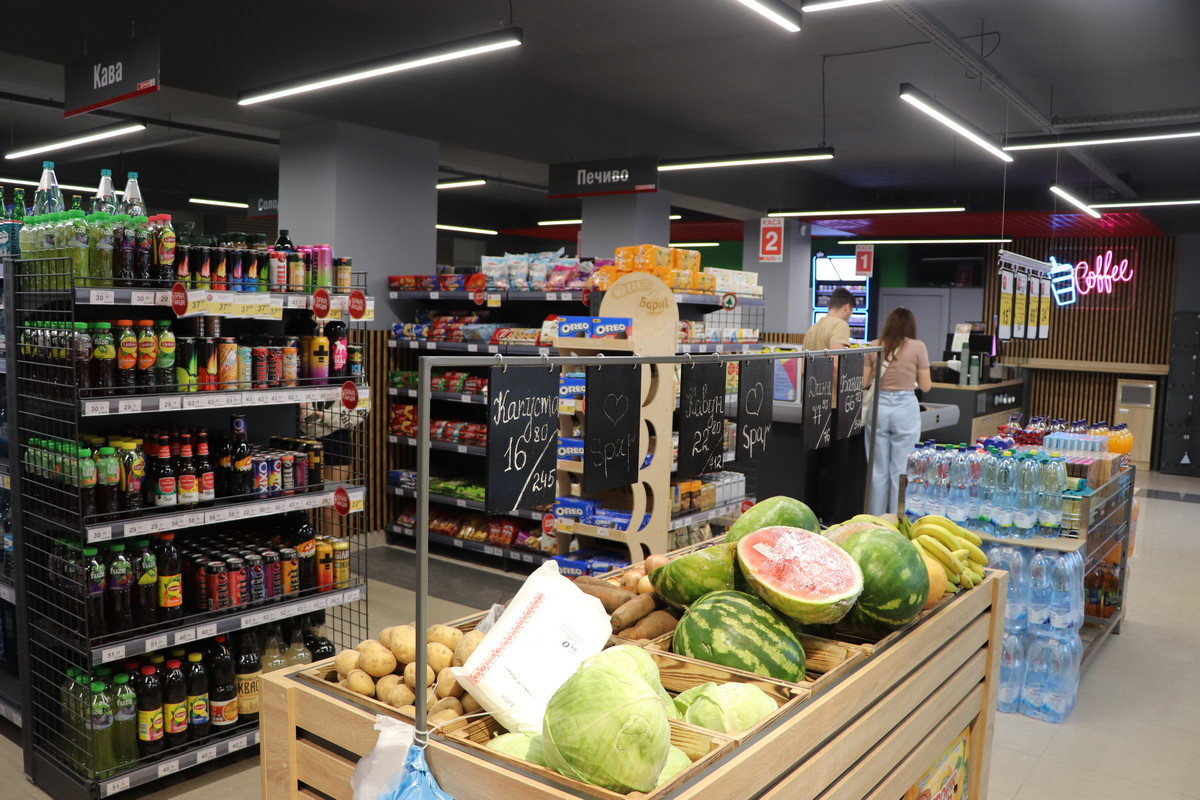 Площа торгового залу складає 259 кв. м, для зручності покупців працюють 3 каси.