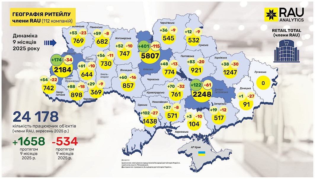 Андрій Жук: Станом на початок грудня в Асоціації ритейлерів України понад 110 членів. Саме їх дані були використані в досліджені географії ритейлу. У 2025 році вже наближаємося до 25 000 магазинів в країні. Попри втрати через війну, наш прогноз до кінця року – зростання на 6,6% від загальної кількості магазинів.