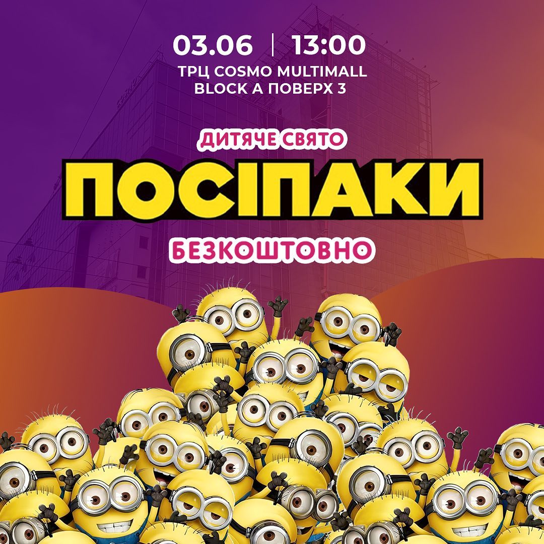3 червня о 13:00 усіх бажаючих очікує безкоштовне свято з Посіпаками у ТРЦ Cosmo Multimall.