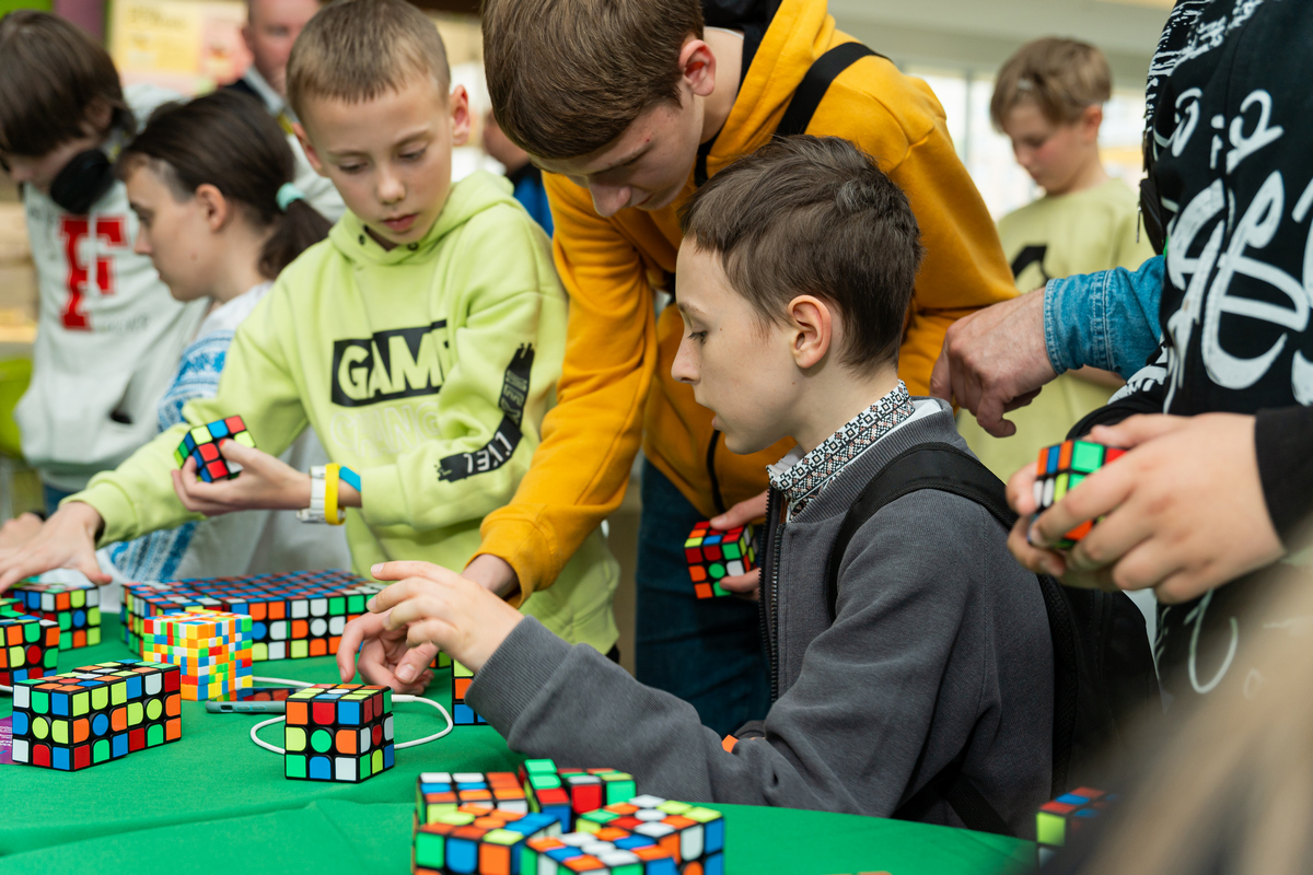 Крім цього, відвідувачі долучилися до майстер-класів зі збору кубика Рубіка та інших головоломок, творчих активностей та навіть міні-турніру зі спідкубінгу — збирання кубика Рубіка на швидкість. А також на активних учасників чекав розіграш призів від Pixel School та українського бренду жіночого одягу Wear Me.