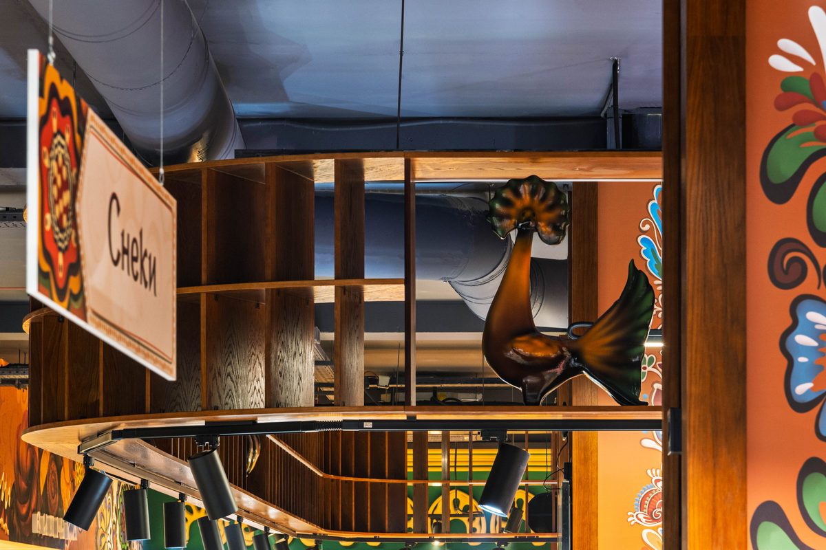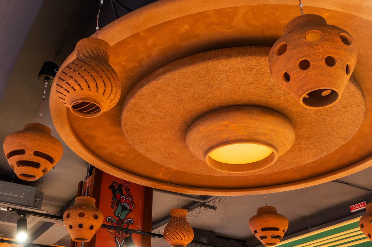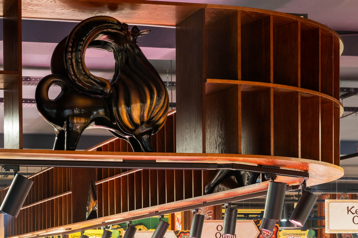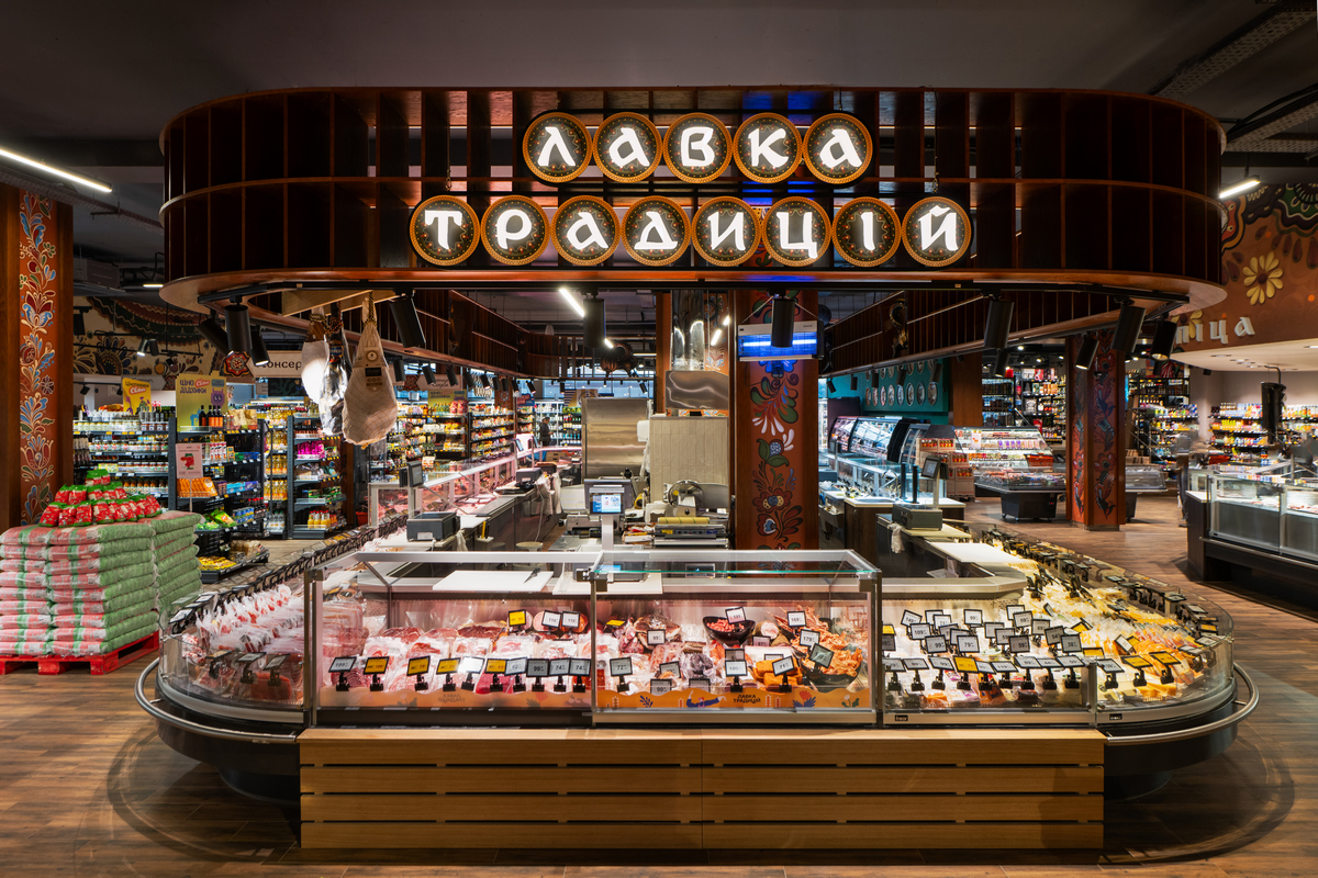 Одразу біля входу відвідувачів зустрічають знайомі силуети півників, а поруч з ними — колони-глечики, розписані вручну. Мотиви майоліки простежуються і у фігурах, і у візерунках, що прикрашають магазин. Над відділом садовини та городини розмістили артоб’єкт — гончарне коло, що обертається, та глечики з підсвіткою навколо нього.