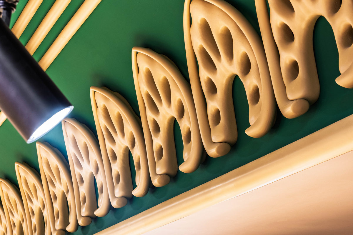 Головний акцент інтер’єру — 16 тарелей, розписаних за ескізами художників Васильківського заводу: Сергія Денисенка, Марини Кривонос, Михайла Денисенка та Володимира Коваленка. Поруч з ними розмістили QR-код, за яким можна прочитати історії митців та більше дізнатися про васильківську майоліку. Шрифт для навігації по магазину створив дизайнер Богдан Гдаль.