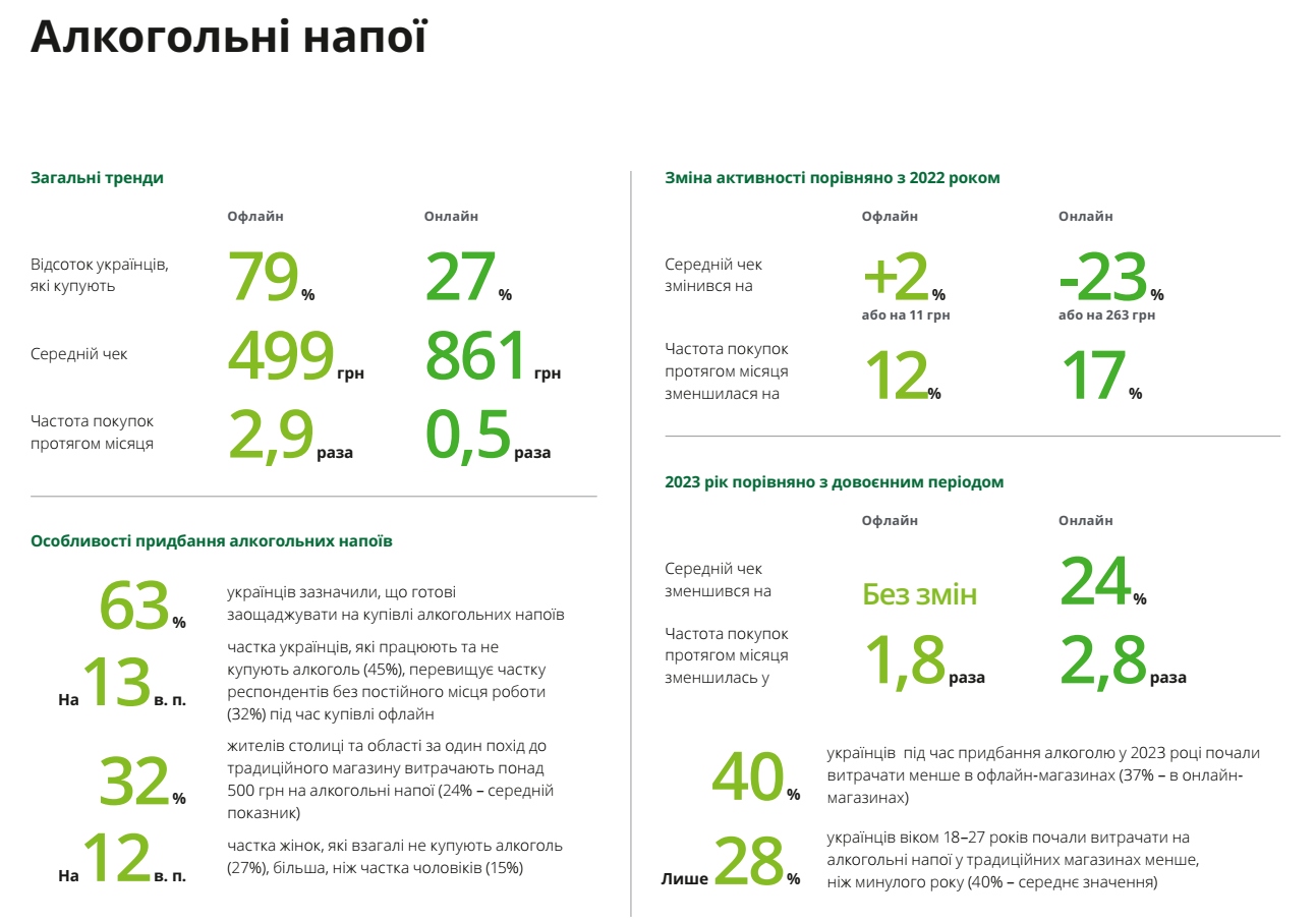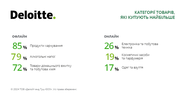 Водночас традиції покупок в звичайних магазинах ще міцні, й офлайн залишається важливим форматом купівлі в житті українців. Найчастіше в традиційних магазинах купують їжу (85%), алкогольні напої (79%), товари для дому та побутову хімію (72%). Але ця частка вже менша ніж у 2022 році на 2-3%. Найбільше впала частка покупок алкоголю в звичайних магазинах – одразу на 4%.
