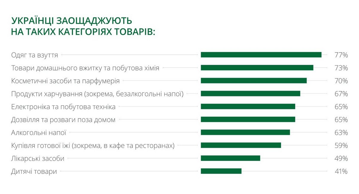 Не дивно, що в 2023 році серед українських споживачів зберігалася тенденція економити. Залежно від категорії товарів, економлять від 41 до 77% українців. Попри те, що показник все ще високий, спостерігається позитивна динаміка, як порівняти з 2022 роком (47–86%). Найменше економлять на лікарських засобах, дитячих товарах та купівлі готової їжі. Найбільше – на купівлі одягу та взуття, товарів домашнього вжитку, косметики та побутової хімії. Водночас 65% українців економлять на розвагах поза домом, а 58% рідше, ніж минулого року, відвідують кінотеатри та концерти. Проте онлайн-розваги стають все більш популярними: 32% українців збільшили витрати на перегляд ТБ та стримінгових каналів.
