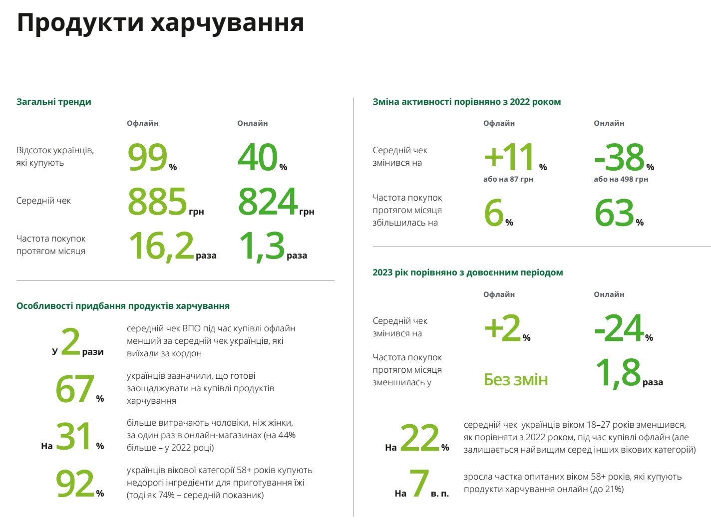 Щодо продуктів харчування, які становлять значну частку чека українців, то витрати в цьому сегменті зросли у 32% споживачів. Значна частина українців (47%) купує їжу про запас. Частота купівлі продуктів харчування в магазинах відновилась до довоєнного рівня – трохи більше 16 разів на місяць, а середній чек збільшився до 885 грн або на 2% порівняно із довоєнним періодом. Покупки онлайн, хоч і стали частішими на 63%, проте цей показник (1,3 раза на місяць) все ще відстає від довоєнного (1,8 раза). Як твердять експерти, збільшення частоти онлайн-покупок одночасно зі зменшенням розміру середнього чеку до 824 грн (-38% відносно 2022 року) свідчить про те, що українці вже звично купують один і той самий набір продуктів як онлайн, так і офлайн.