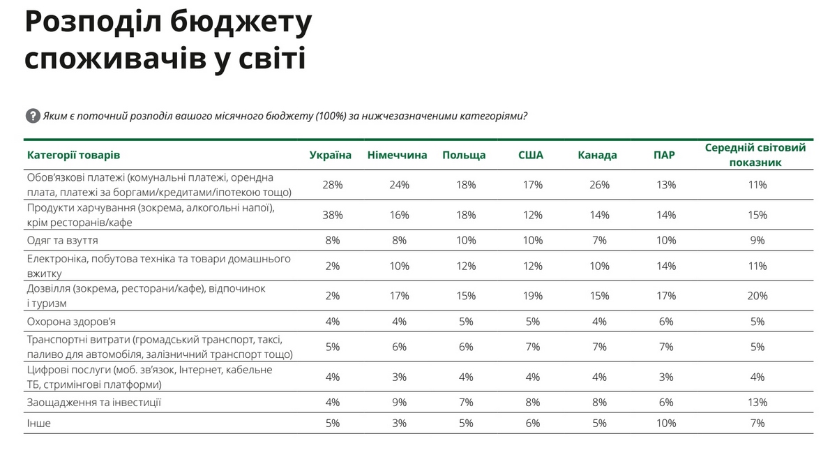 Цього разу вперше експерти порівняли купівельні настрої українців із жителями ЄС та США. Як виявилося, структура бюджету українців досить суттєво відрізняється у порівнянні зі світовими трендами. Так, більш ніж половину місячного бюджету (66%) українці витрачають на їжу та обов’язкові платежі. Натомість у сусідній Польщі на ці витрати припадає лише 36%, а у більш заможній Німеччині – 40%. Близько третини бюджету йде на подібні цілі в жителів США.